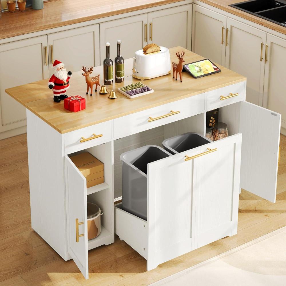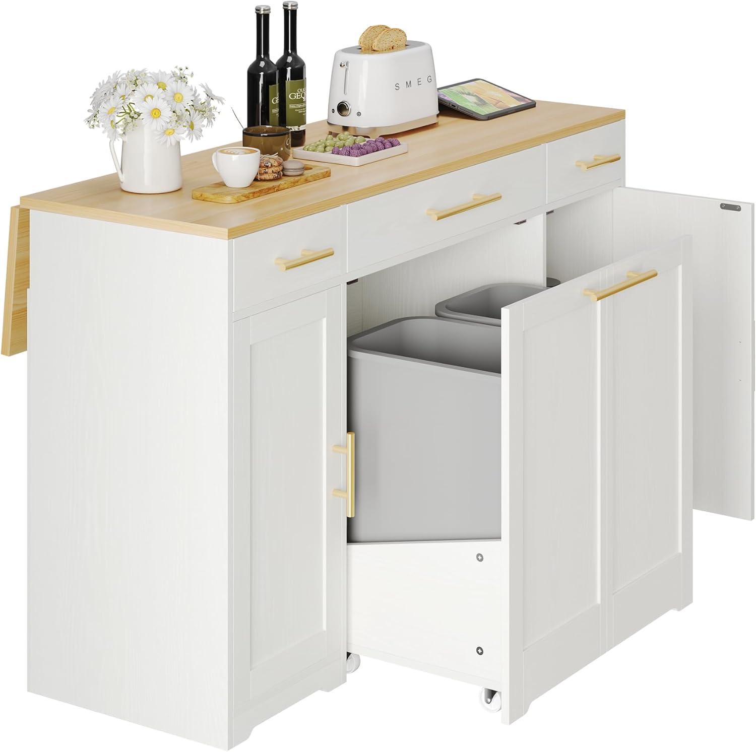imageYITAHOME Folding Kitchen Table with Power Outlet Drop Leaf Kitchen Table Islands for 2 on Wheels Convertible Trash Can Storage Cabinet for 10 Gallon Garbage Bin Adjustable Storage Racks Wihte OakWhite Oak