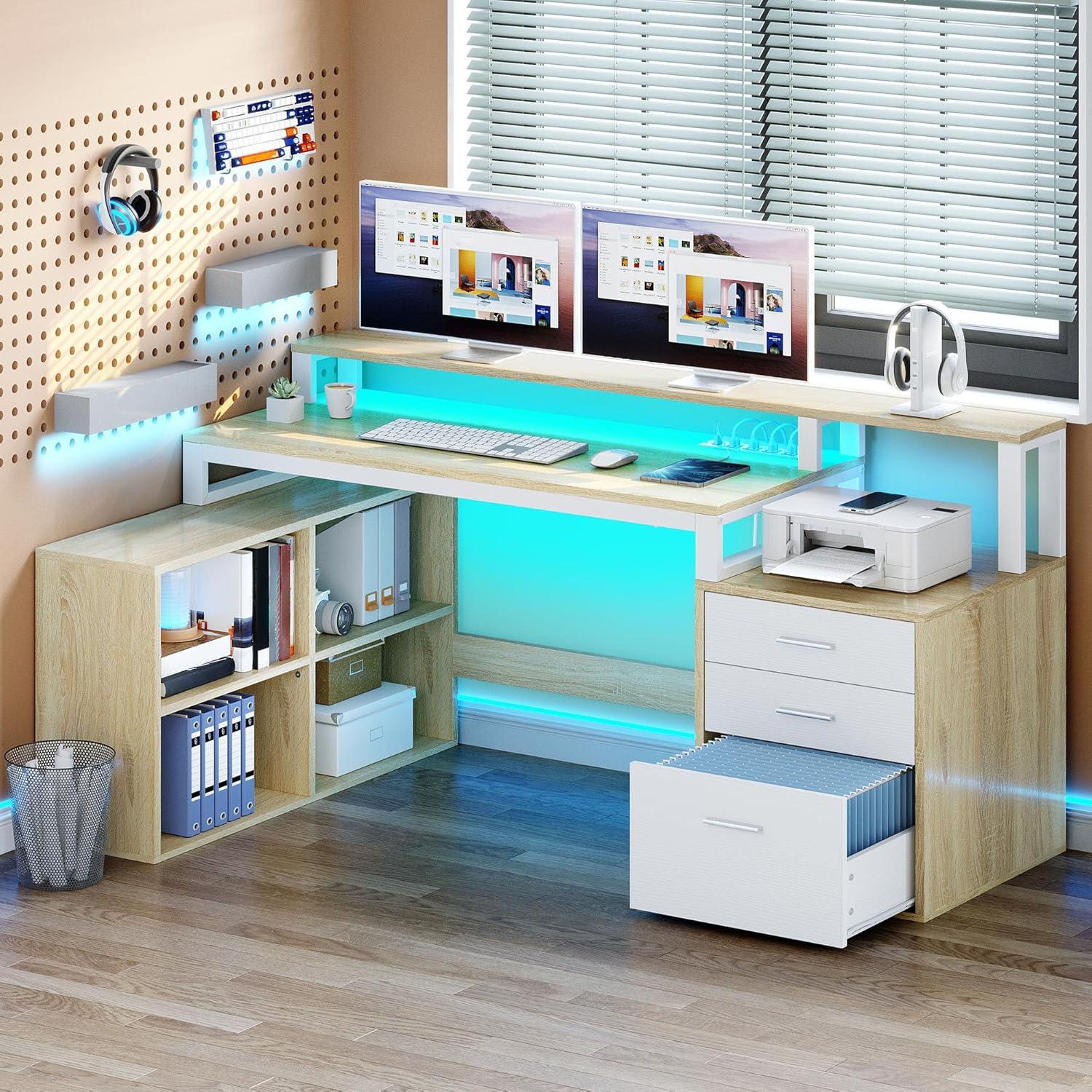 YITAHOME L Shaped Desk with 3 Drawers, 65" Corner Computer Desk with Power Outlets & LED Lights, L-Shaped Desk with File Cabinet & Printer Stand for Home Office, White & Oak(White & Oak)