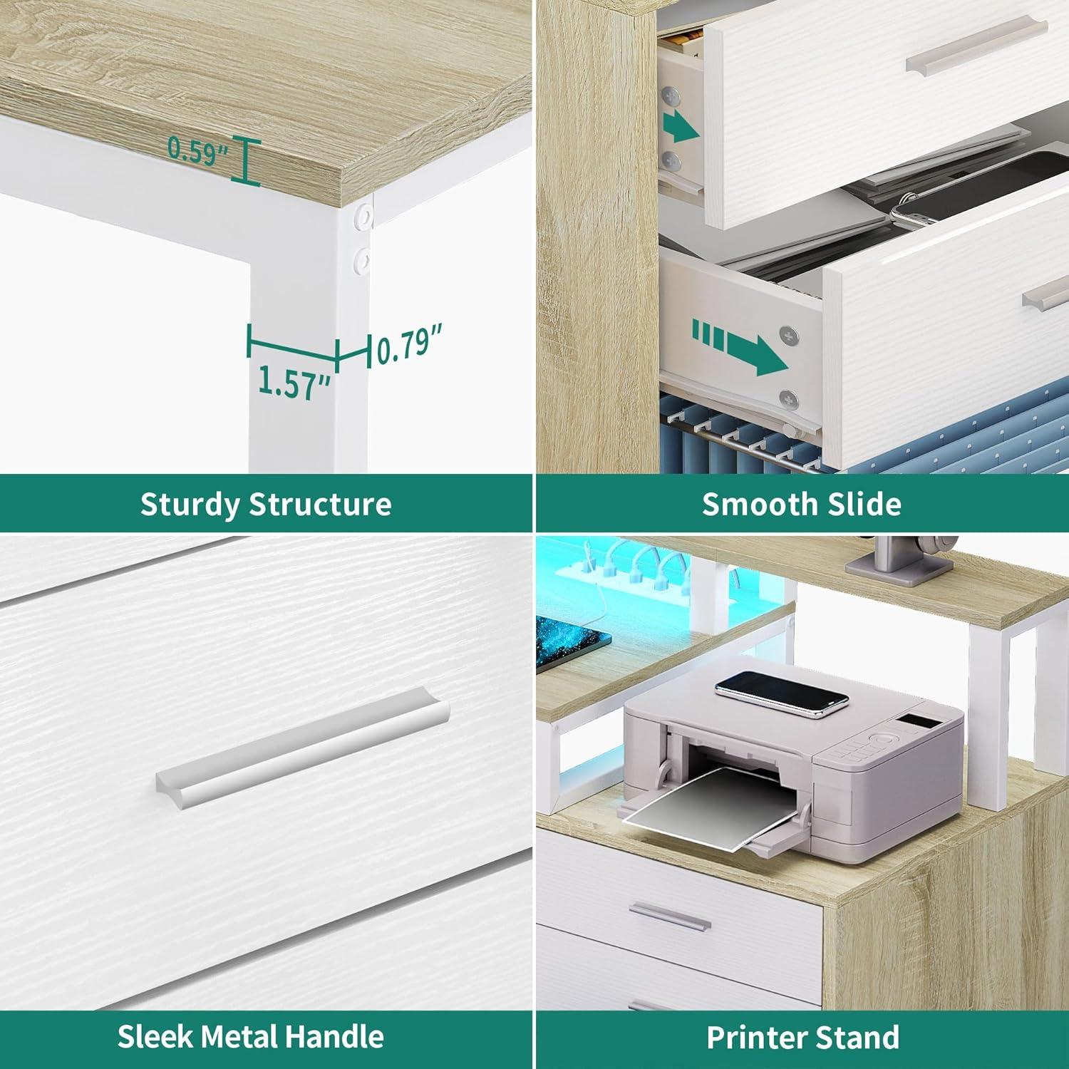 Corner Desk with File Cabinet: 2-in-1 corner desk combines a computer desk with 2 file cabinets featuring 1 file drawer with adjustable hanging bars for letter, A4, legal size files, 2 drawers for small office supplies, and 4 open storage shelves store more office essentials. Also, the printer stand hold printers, scanners, fax machines or any other office machines within your reach to boost work performance