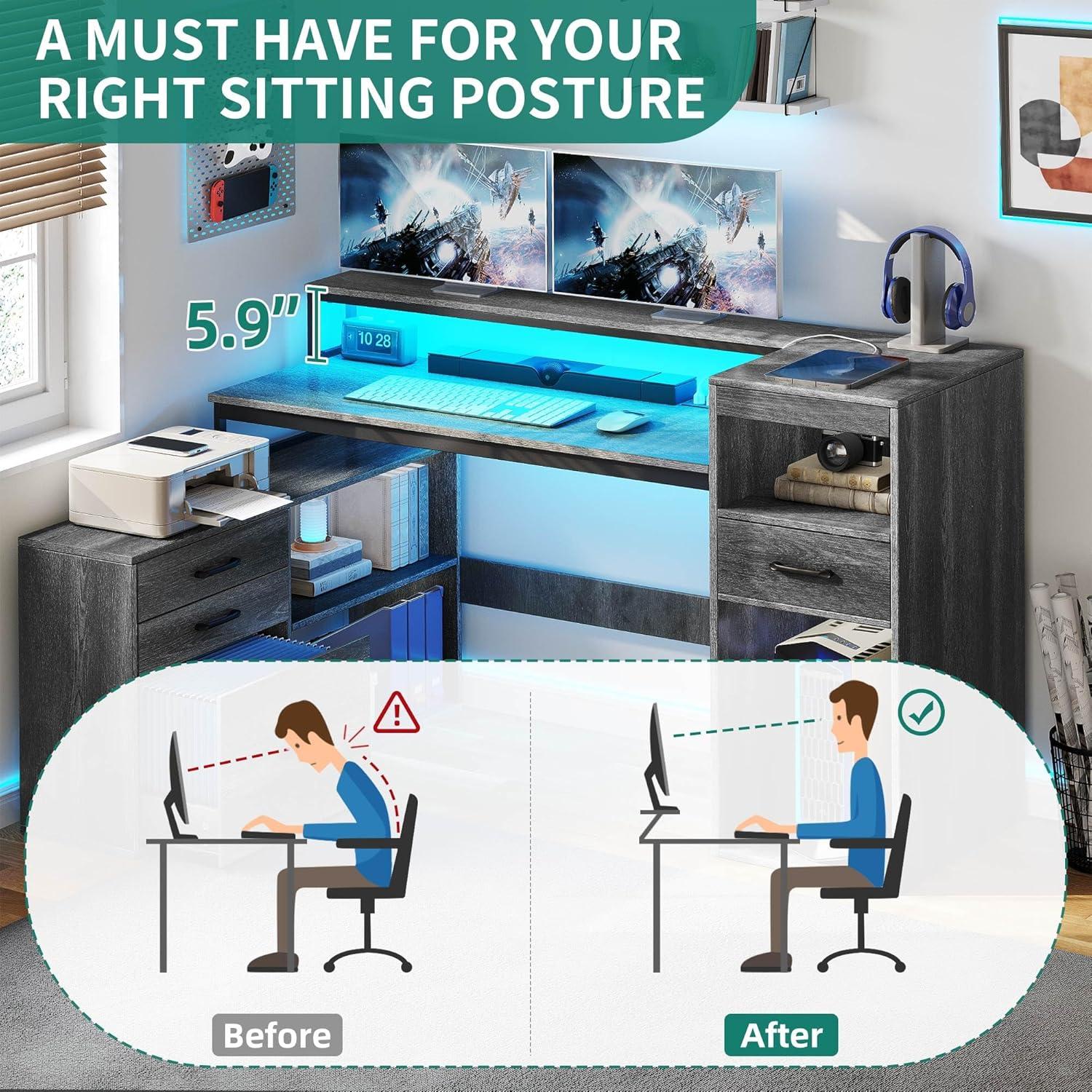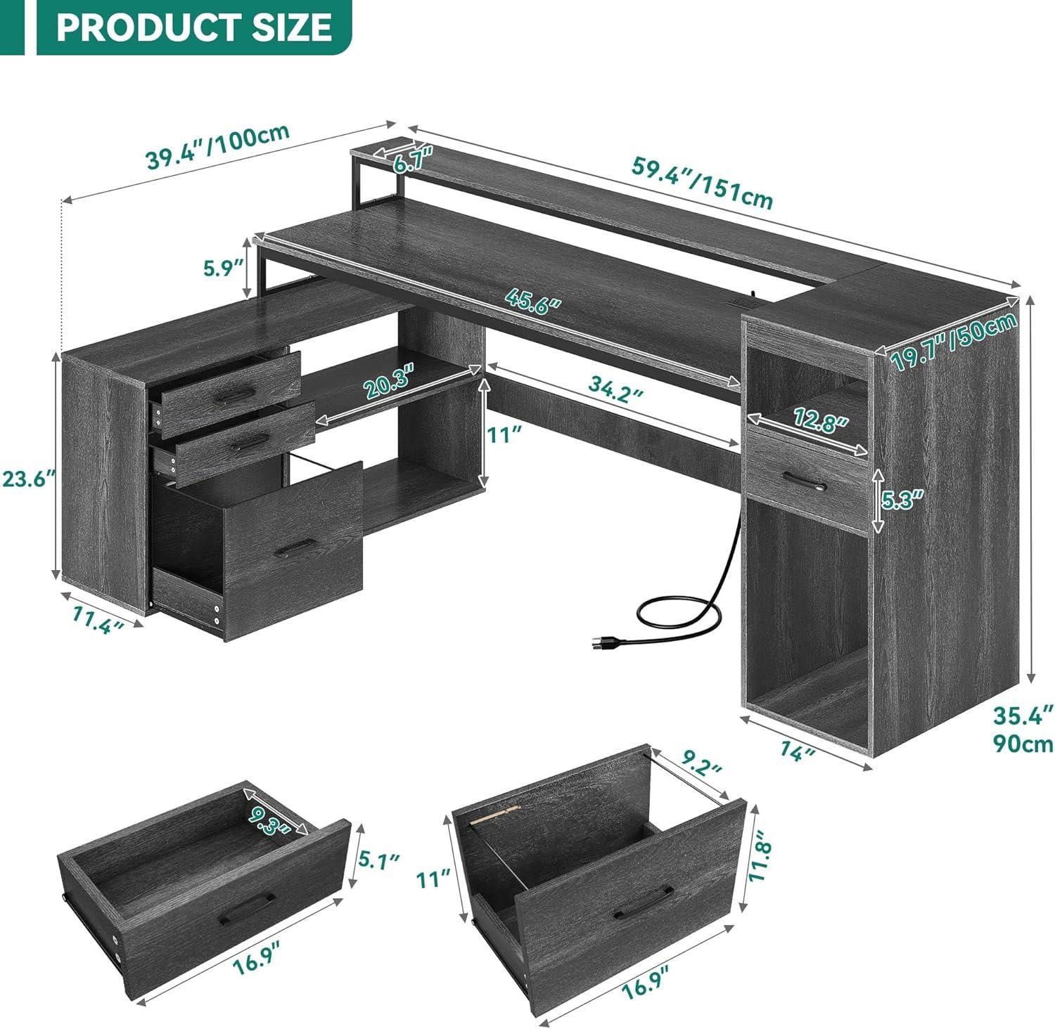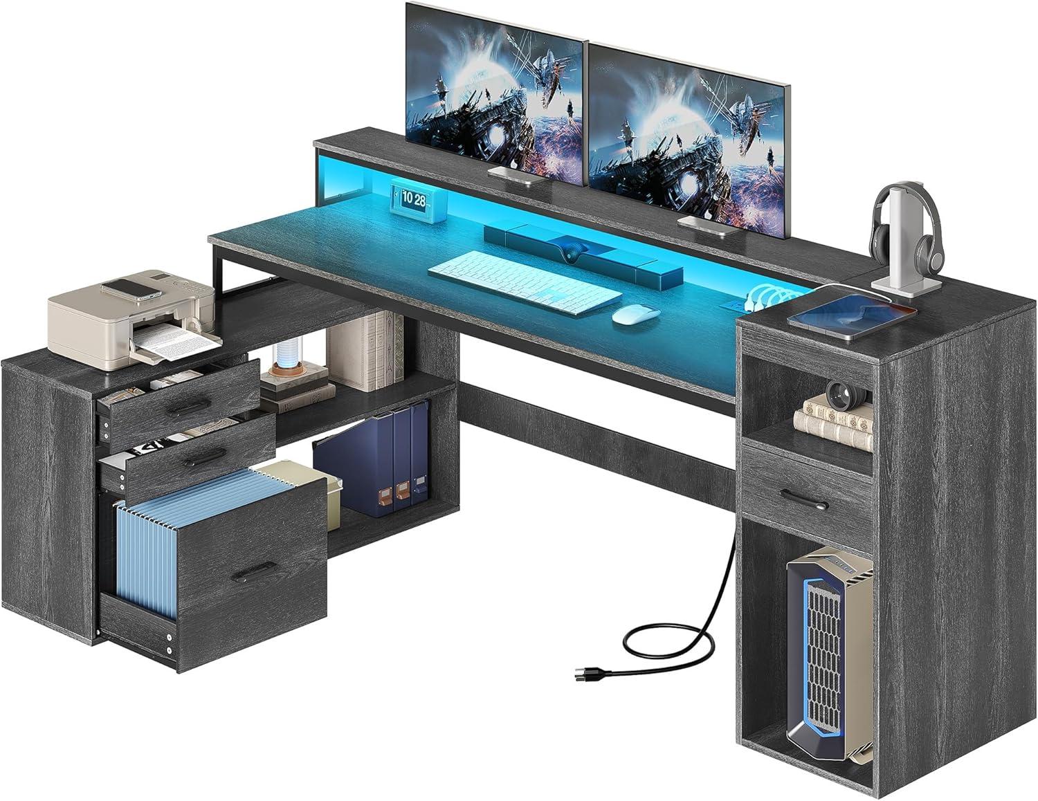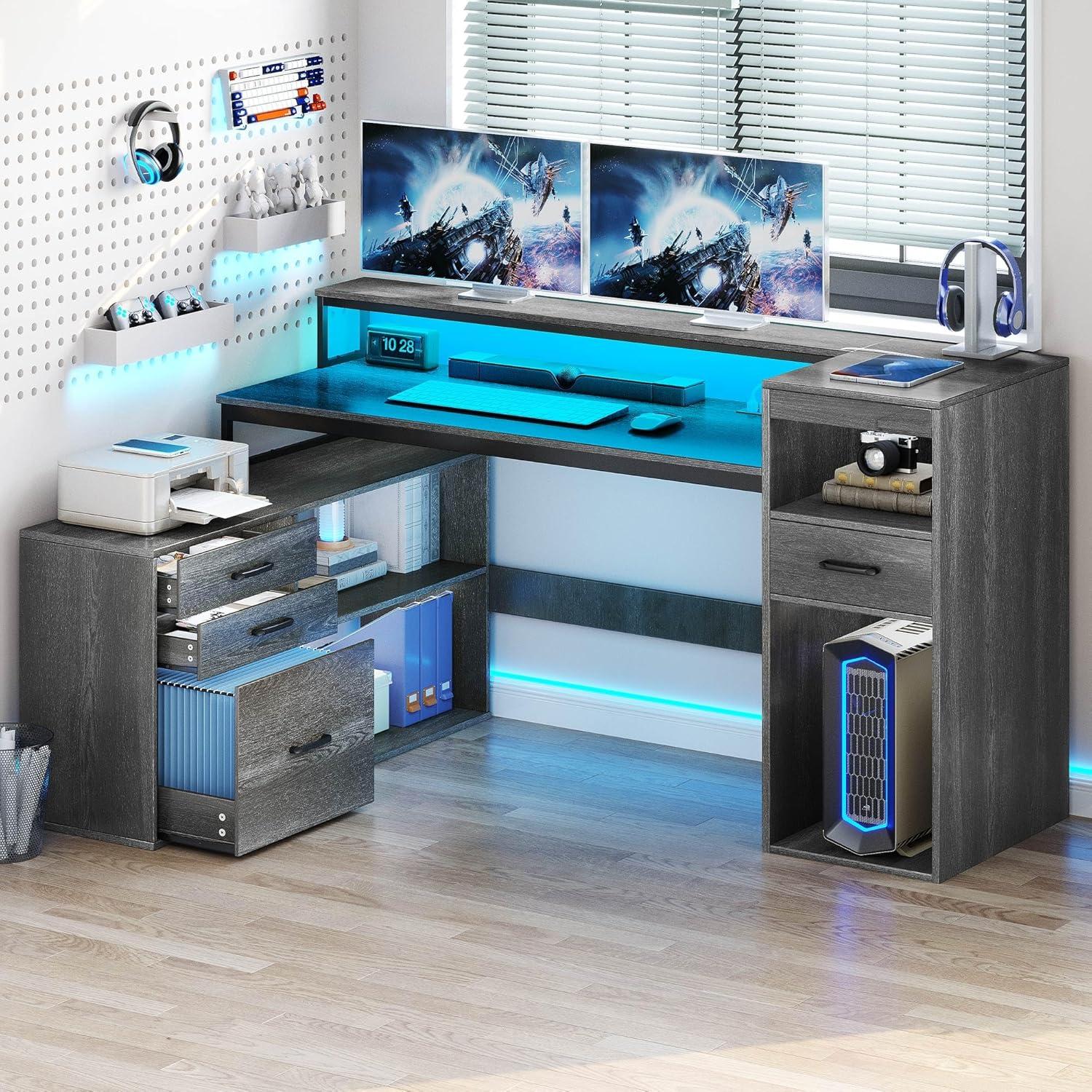 YITAHOME L Shaped Desk with Drawers, 59″ Corner Computer Desk with Power Outlets & LED Lights, Farmhouse Wood L-Shaped Desk with File Cabinet, Printer Stand, Host Stand for Home Office, Grey(Carbon Grey)