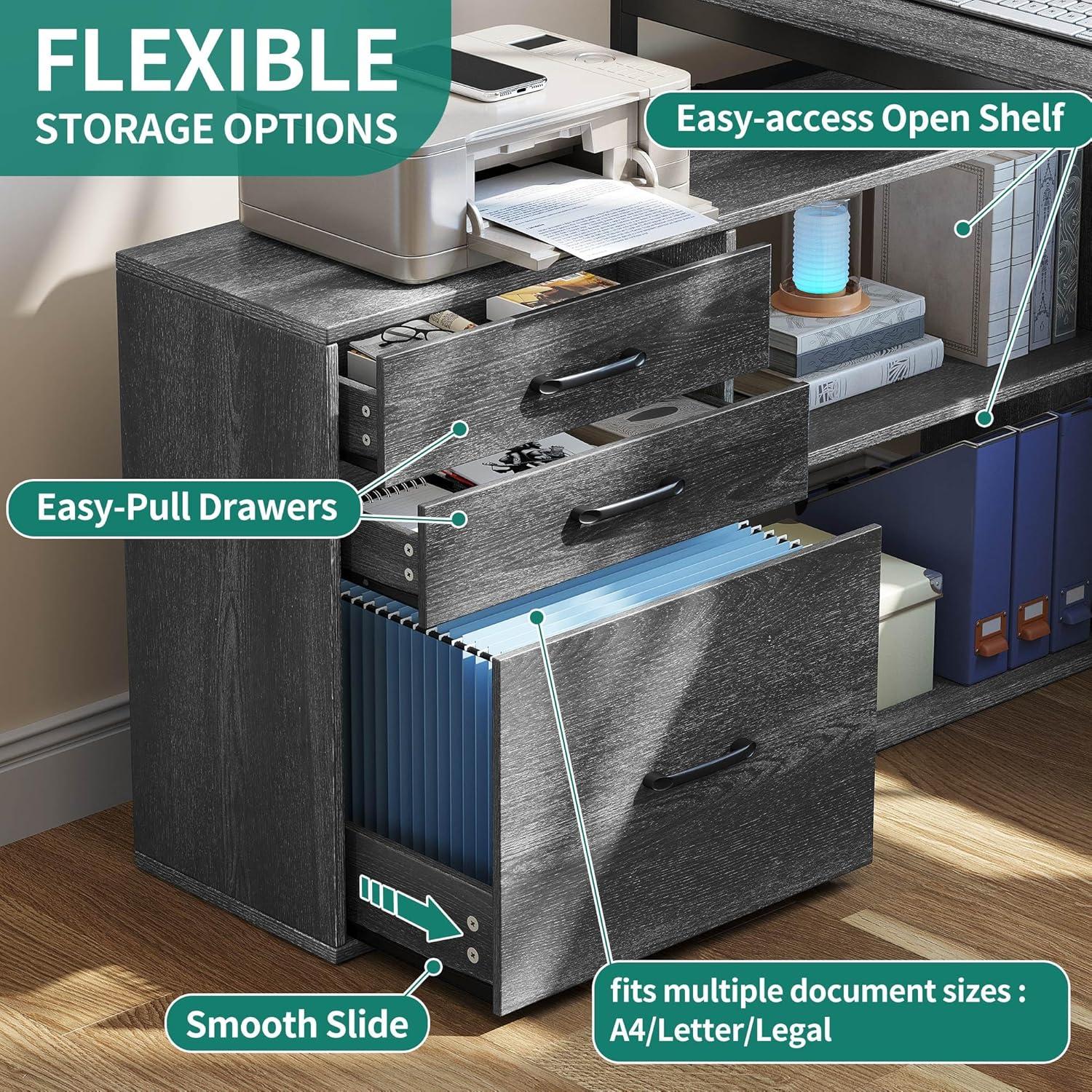 Corner Desk with File Cabinet: 2-in-1 corner desk combines a computer desk with 2 file cabinets featuring 1 file drawer with adjustable hanging bars for letter, A4, legal size files, 3 drawers for small office supplies, 1 open storage shelves store more office essentials and 1 host stand for your hosts. Also, the printer stand hold printers, scanners, fax machines or any other office machines within your reach