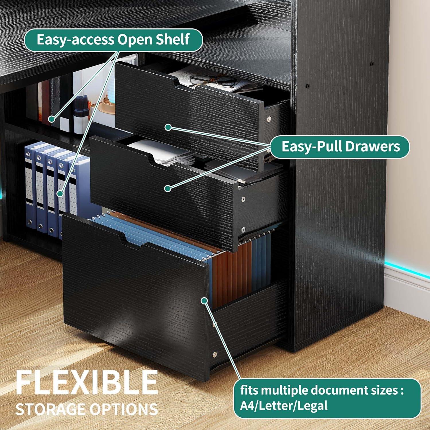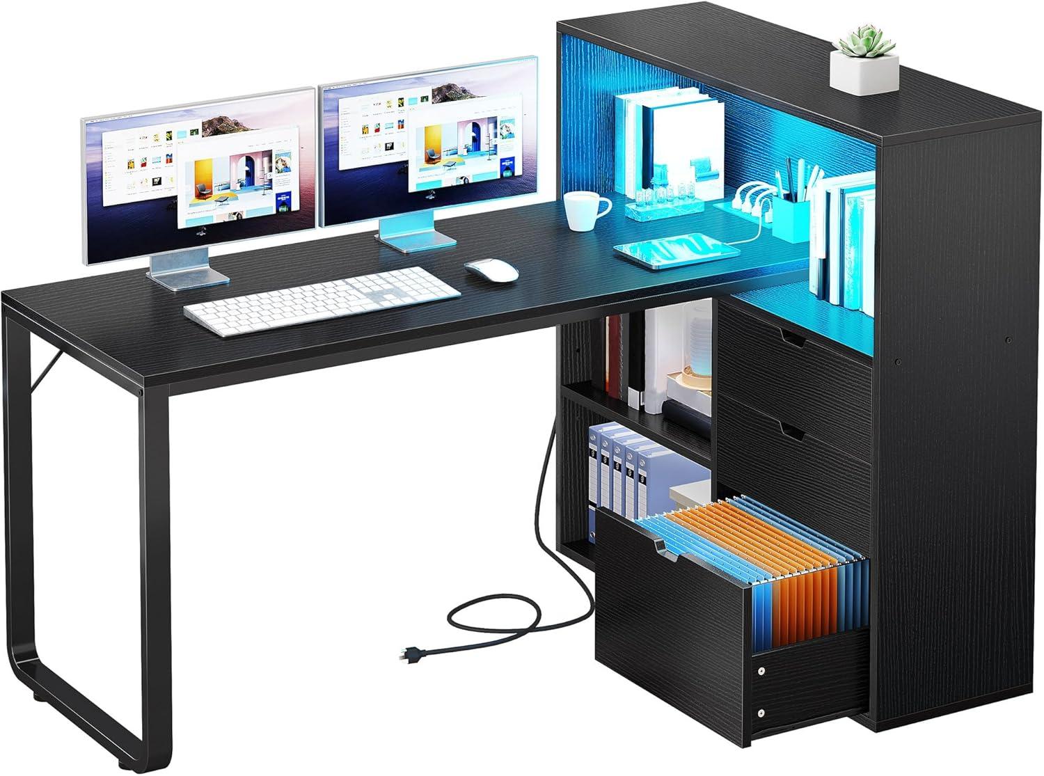 imageYITAHOME L Shaped Desk with Power Outlets 55 Computer Desk with Drawers amp Bookshelf Home Office Desk with LED Lights Corner Desk with File Cabinet WhiteBlack