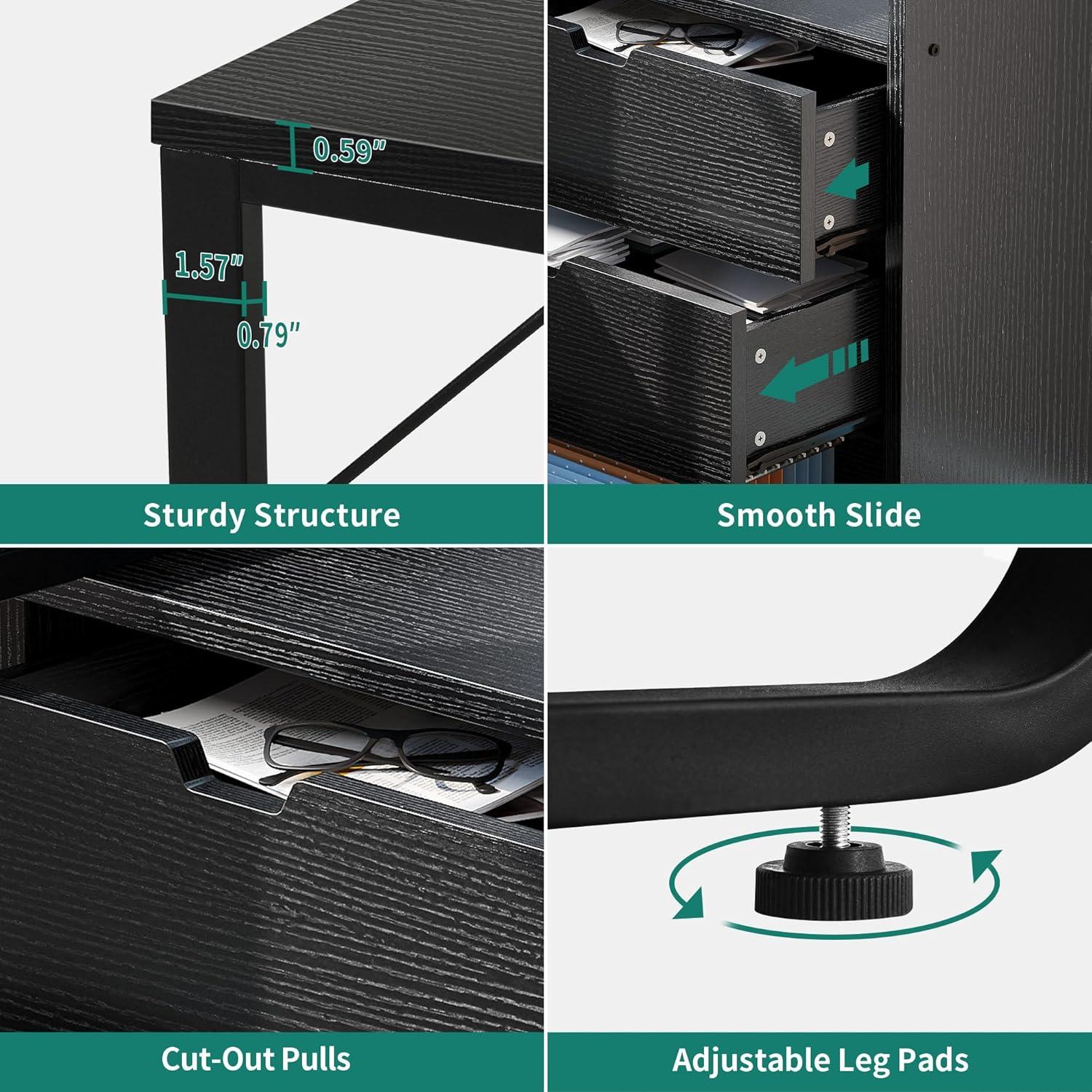 Ample Storage Space: 2-in-1 corner desk combines a computer desk with a file cabinets featuring 1 file drawer with adjustable hanging bars for letter, A4, legal size files, 2 drawers for small office supplies, and 2 bottom open storage shelves with 3-heights adjustable for different heights item. Also, the spacious upper open shelf can be also used as printer stand holding printers, scanners, fax machines or any other office machines within your reach