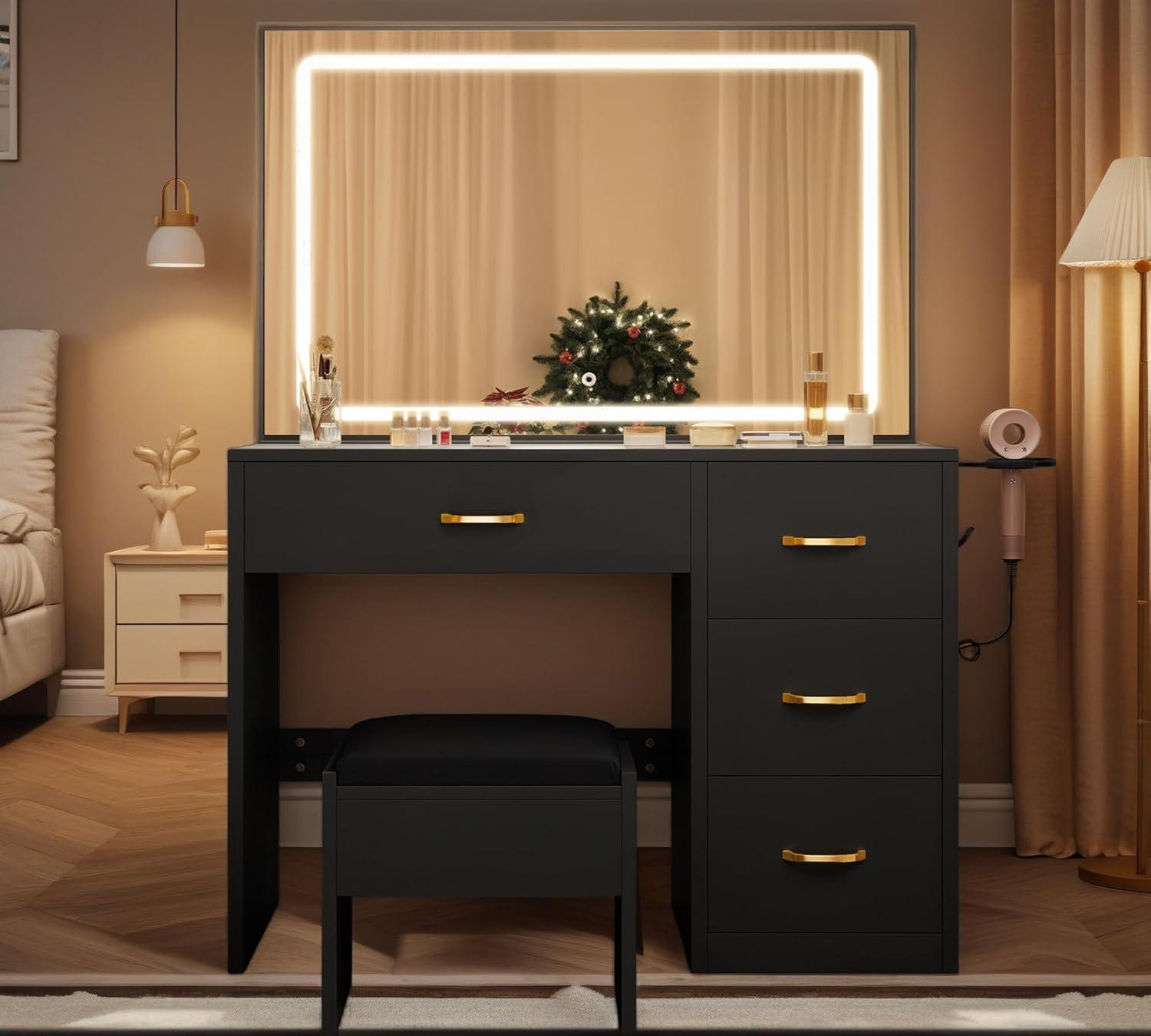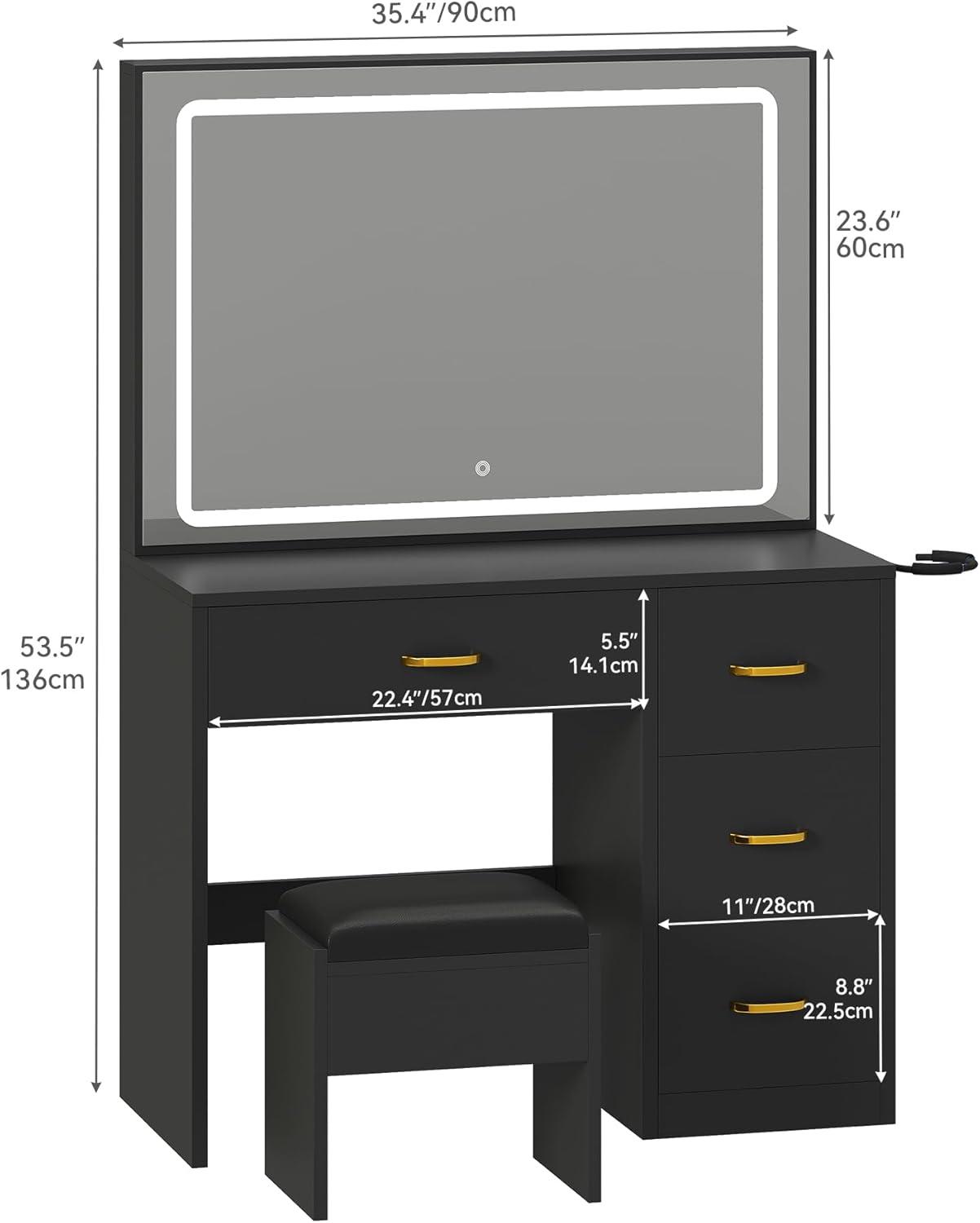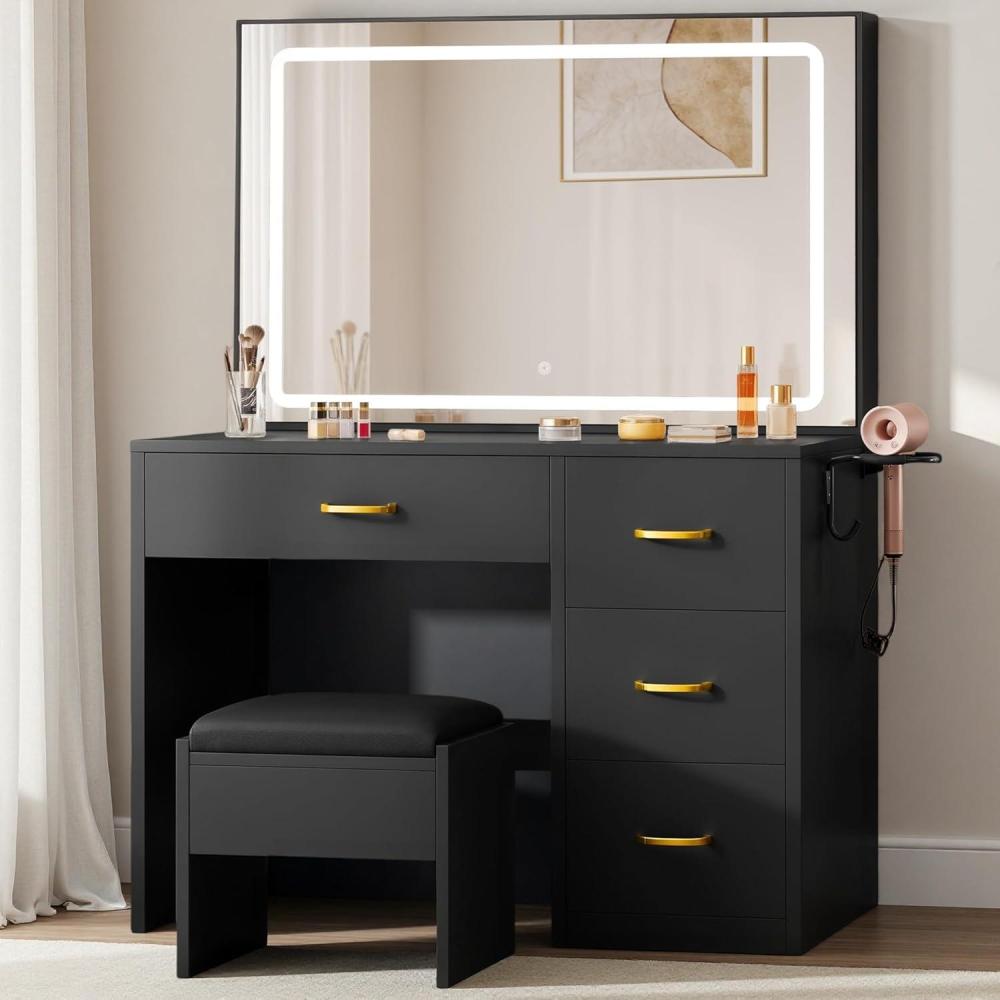 Elevate your beauty routine with this makeup vanity set, featuring a large LED mirror with 3 adjustable lighting modes for flawless application. Keep all your cosmetics, brushes, and accessories organized in 4 spacious drawers. The built-in charging station with outlets, USB, and Type-C ports powers your devices while you get ready. Complete with a cushioned PU leather stool and durable PB/MDF construction, this sleek black vanity combines style, functionality, and lasting elegance.