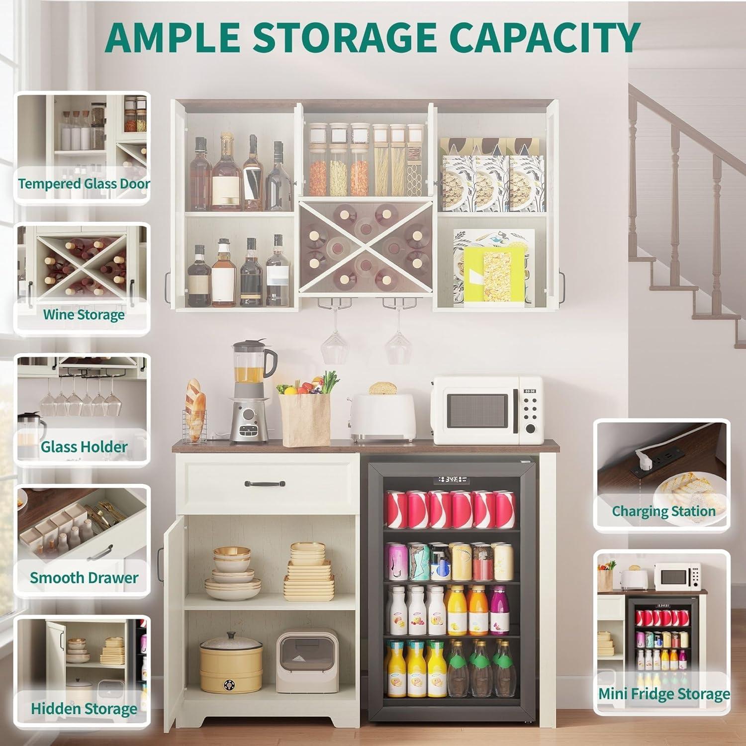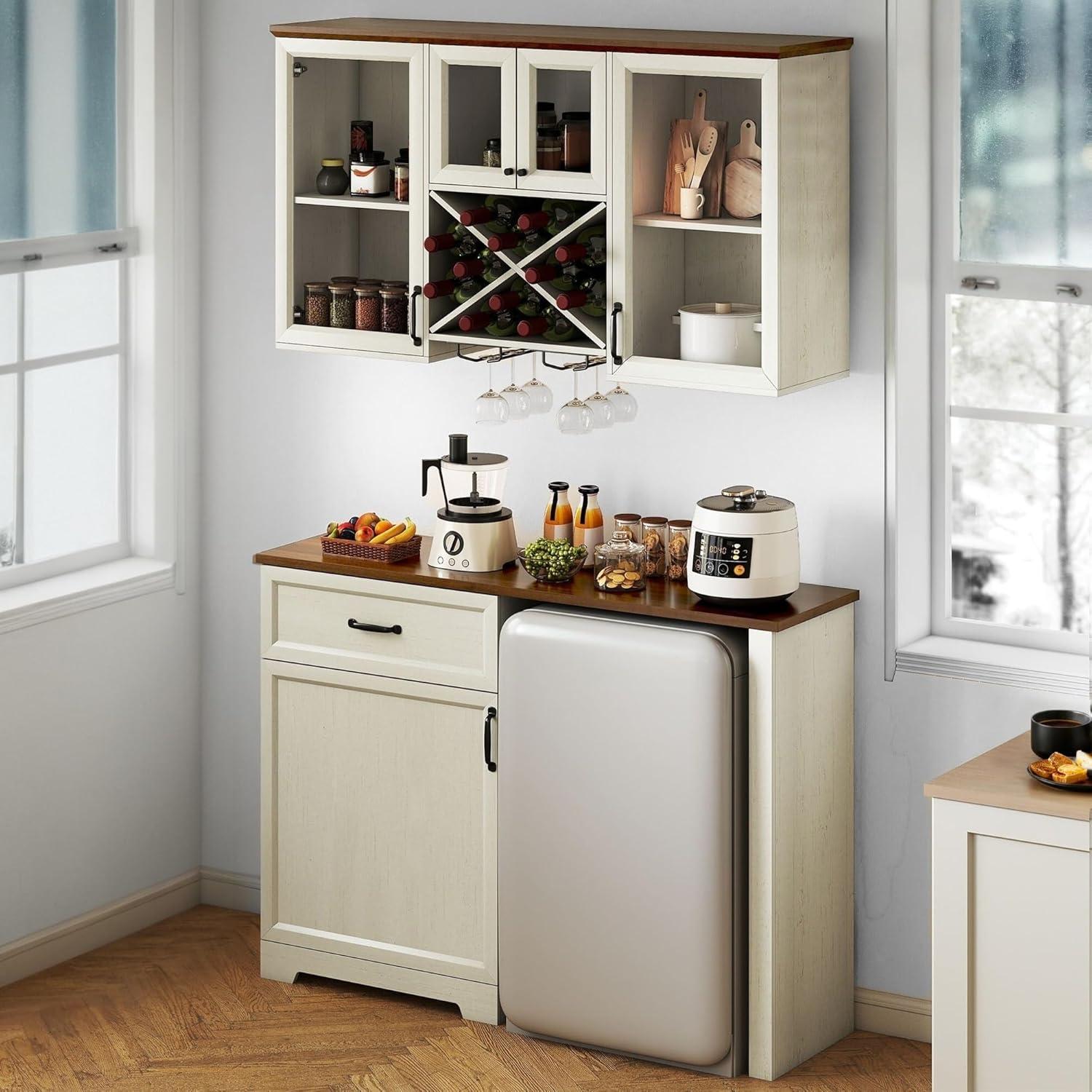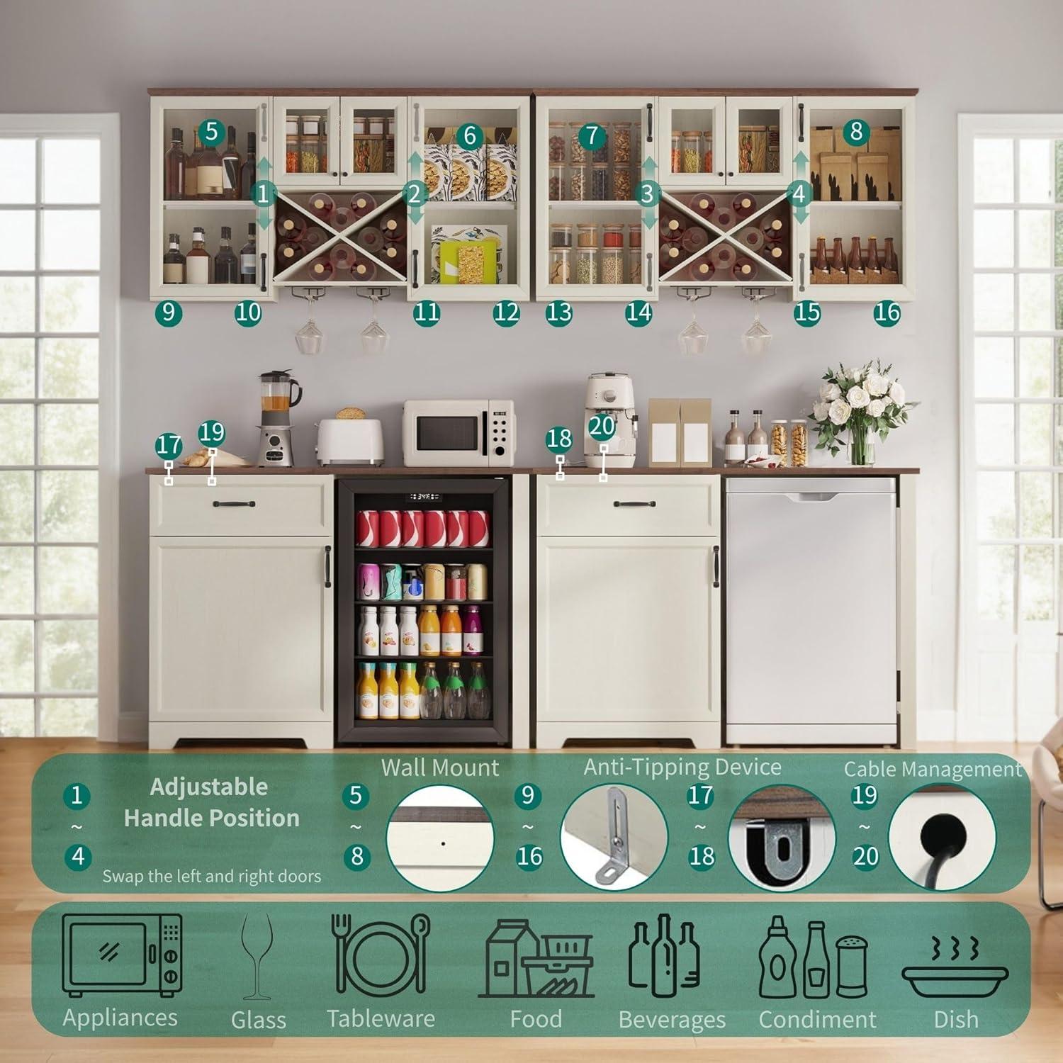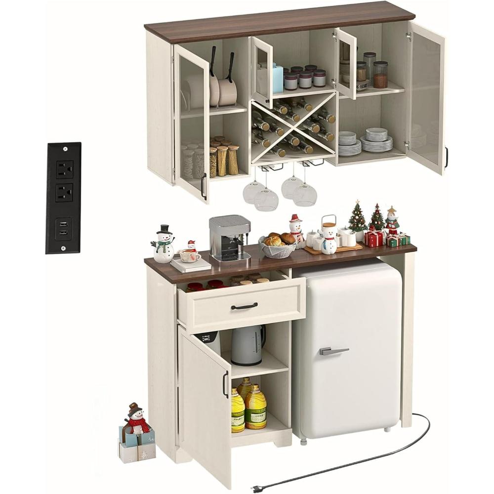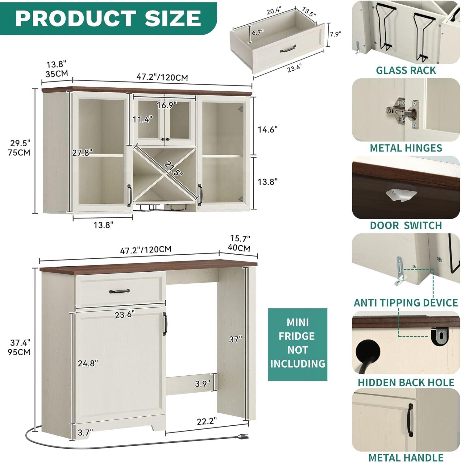 Multi-Functional Storage: This modular set includes a wall cabinet (13.8″D x 47.2″W x 29.5″H) with 4 glass doors, 5 visible compartments, an X-style wine rack, and 2 stemware holders, plus a floor cabinet (15.7″D x 47.2″W x 37.4″H) offering hidden storage, a bar countertop, and dedicated mini fridge space. The flexible two-piece design allows custom arrangement to fit your kitchen, dining room, or living area, delivering smart organization with rustic charm.
