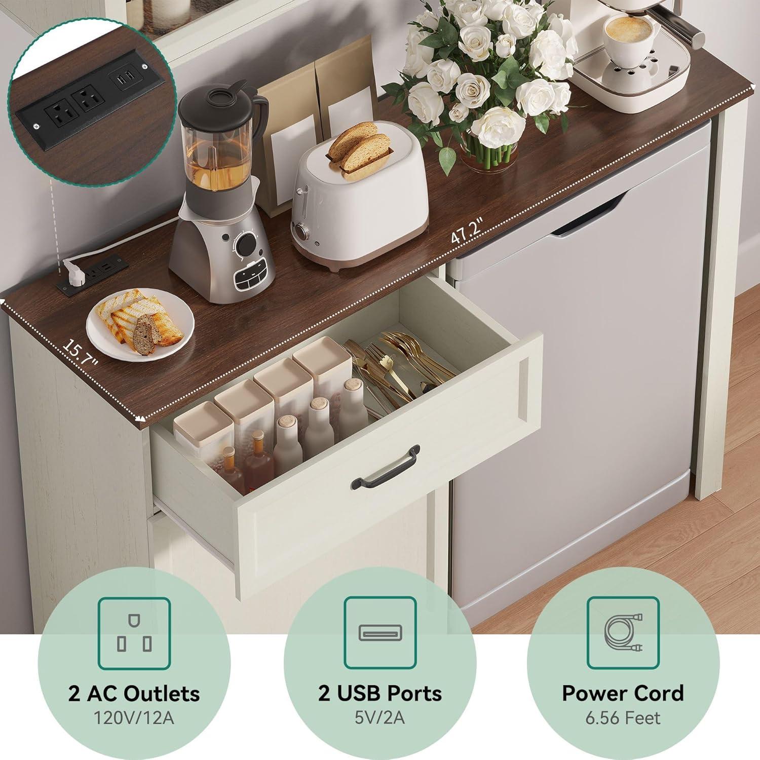 Convenient Charging Stations: 15.7″D x 47.2″W spacious countertop offers ample space for appliances like coffee makers and blenders. The built-in power strip includes 2 AC outlets and 2 USB ports for cord-free convenience. Added practicality comes with a smooth-sliding drawer for utensils and a hidden double-door cabinet that stores small kitchen gadgets-making this cabinet a functional and efficient beverage station for everyday use.