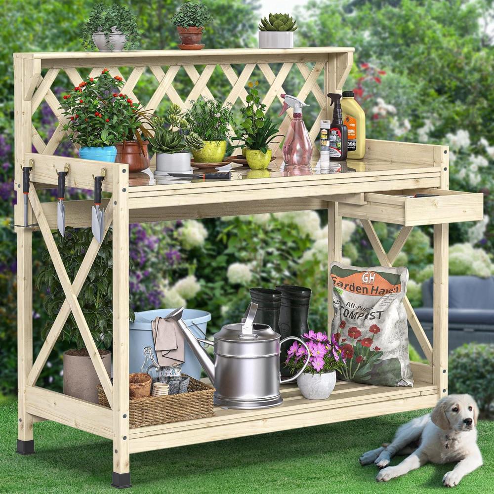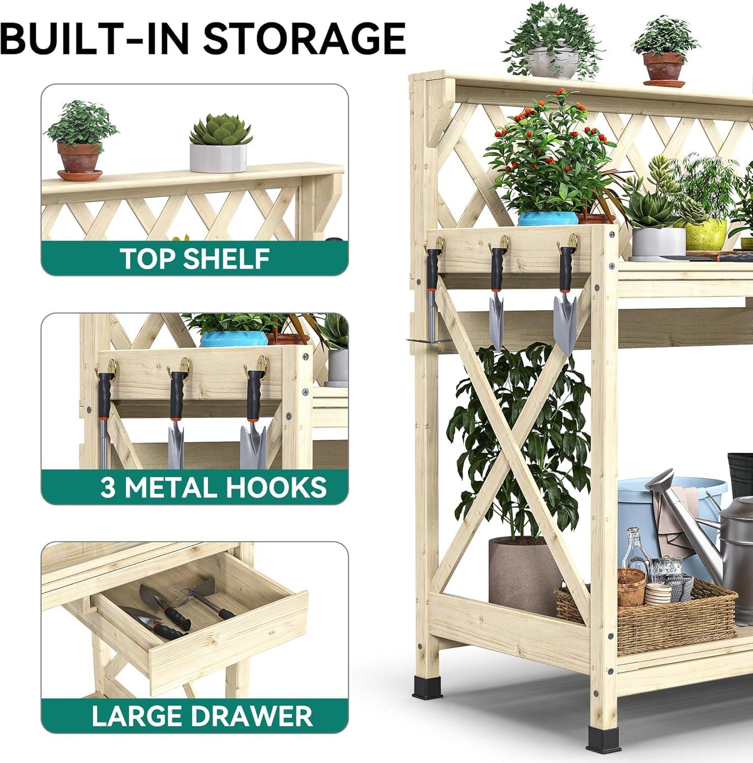 Flexible Storage: Keep your gardening essentials organized with this potting table. The tabletop showcases potted plants, while the ample lower shelf accommodates soil or gardening tools. Convenient side hooks are ideal for hanging tools, bags, or towels, and the discreet storage drawer provides a tidy space for seeds, gloves, and labels.