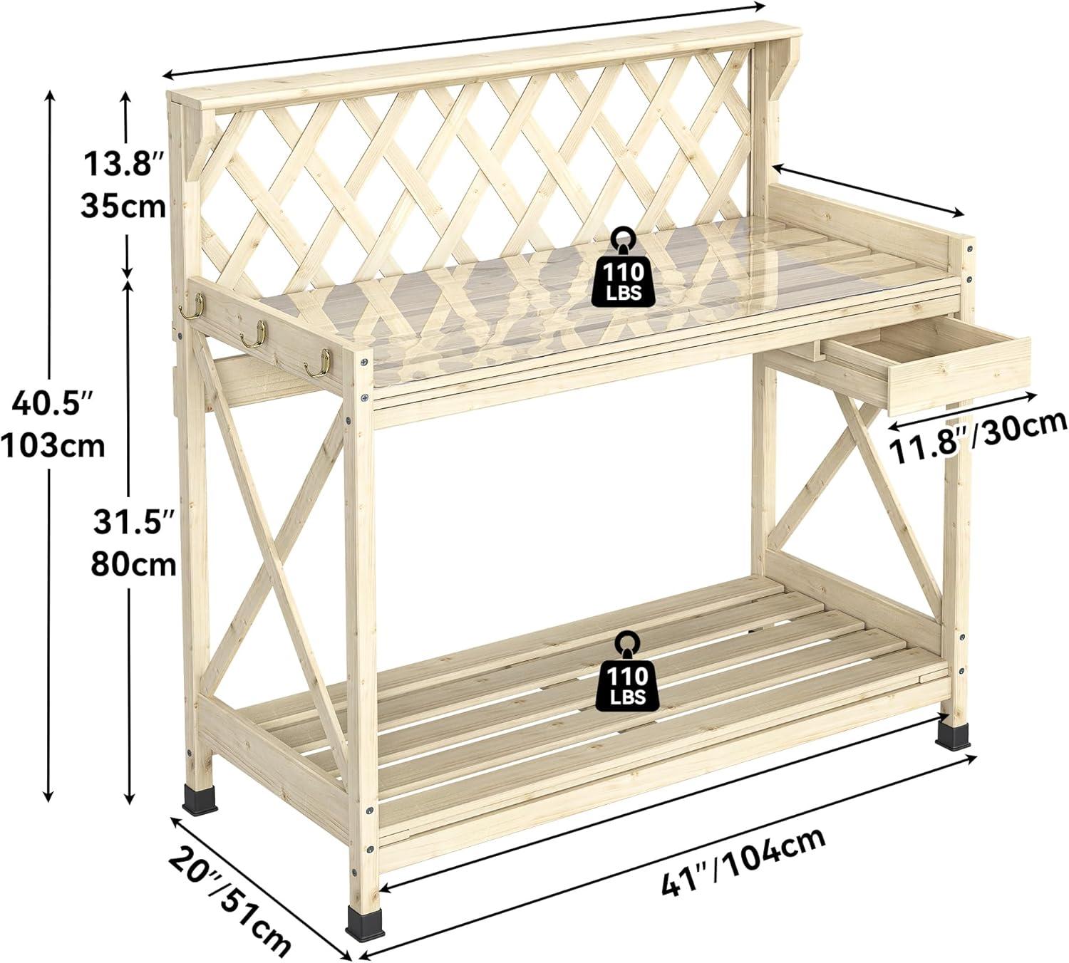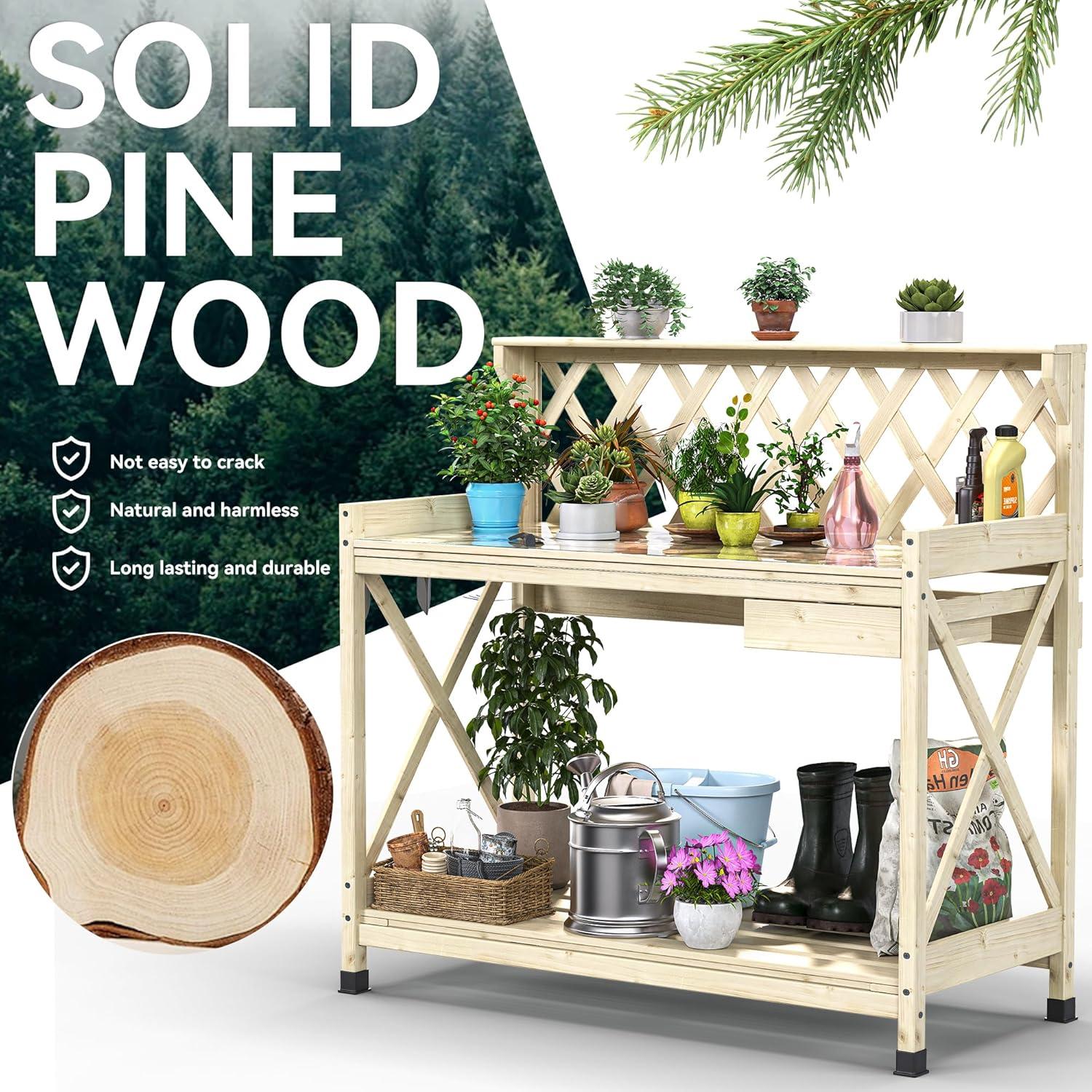Sturdy Pine Timber: The outdoor potting bench is expertly designed with premium pine wood, renowned for its exceptional resilience to rust, warping, and splitting, ensuring enduring strength and durability in outdoor settings. A protective paint coating enhances its lifespan.