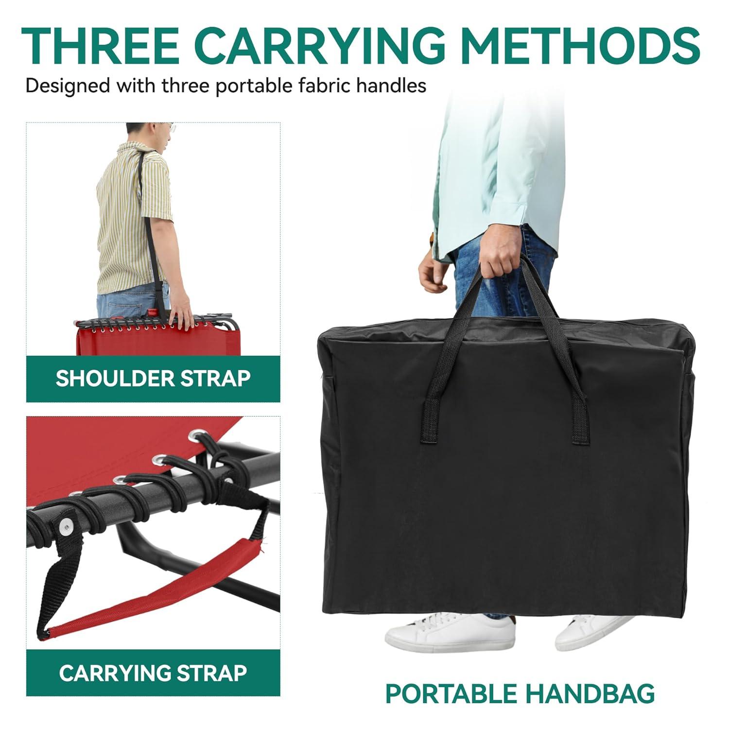 SIDE BAG & CARRY BAG – The recliner comes with a 600D Oxford cloth side bag that allows you to put some of your belongings in case you lose them, and an Oxford 300D portable storage bag that allows you to easily carry your recliner after folding, making your travel more convenient