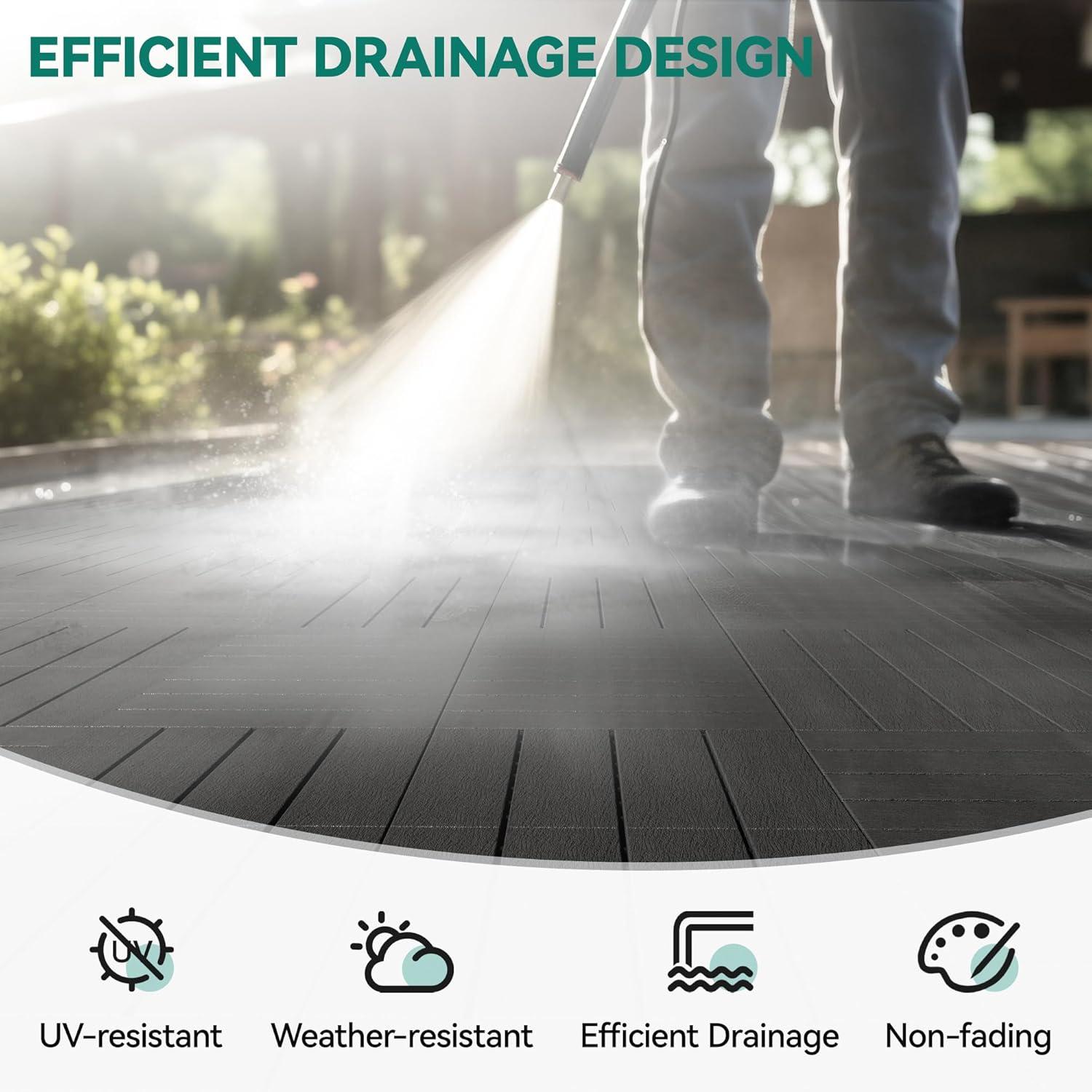 Superior Drainage System: Our outdoor floor tiles are designed with 4 flat surfaces and 3 drainage channels, this design prevents water pooling and promotes better air circulation; Unlike others, our patio deck tiles incorporate an anti-slip and noise-reducing feature at the bottom, enhancing stability and firmness