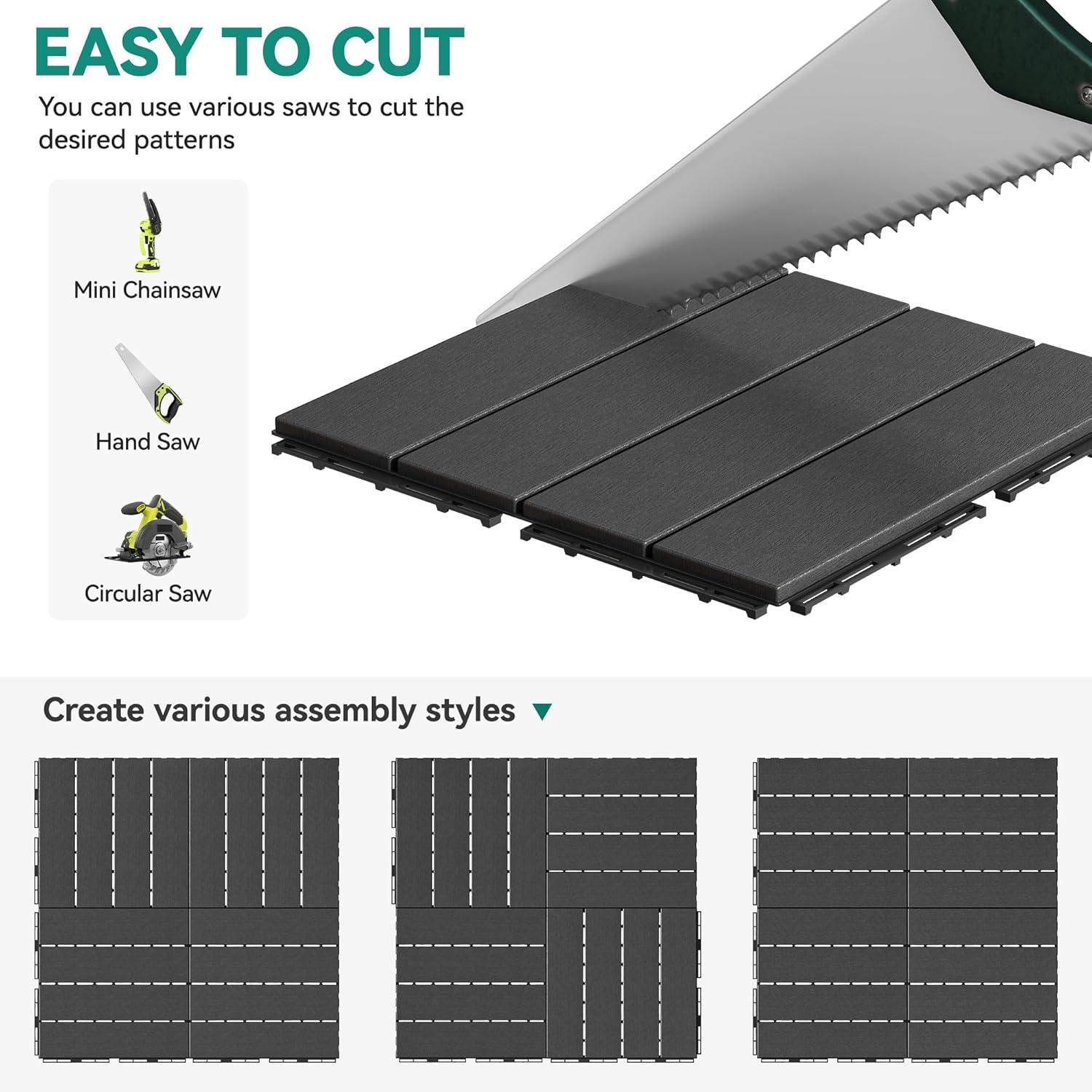 Easy Maintenance & Versatile Use: Cleaning these outdoor patio flooring is simple with a water gun or other tool; Ideal for busy homes, tiles can be customized with a saw to fit various spaces; Suitable for outdoor areas like patios and gardens, as well as indoor areas like bathrooms and living rooms