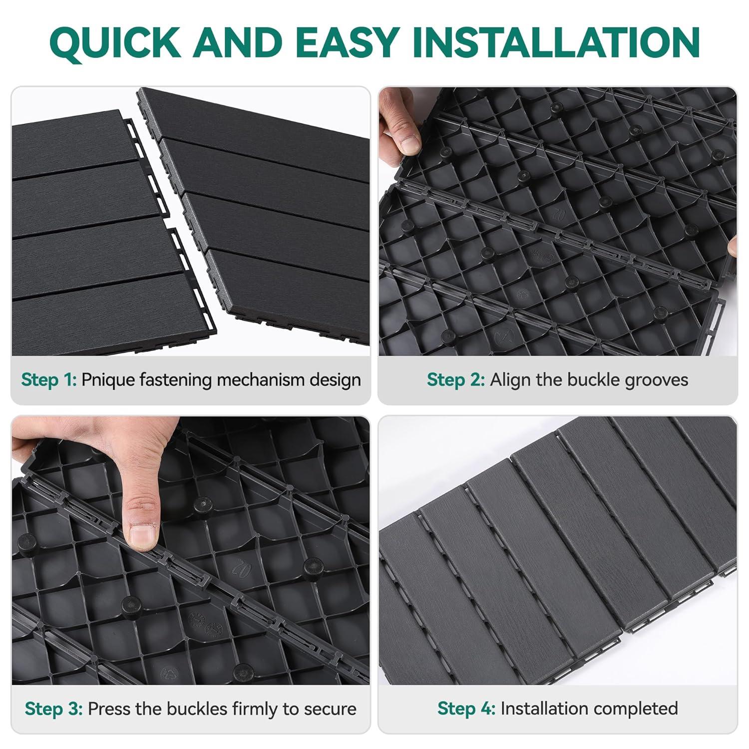 Easy Snap Installation: Our upgraded interlocking design allows for faster and safer installation with no tools needed; The rectangular snap design ensures a tight connection between tiles that's not easy to separate; If needed, you can also easily disassemble these outdoor tiles for patio within minutes