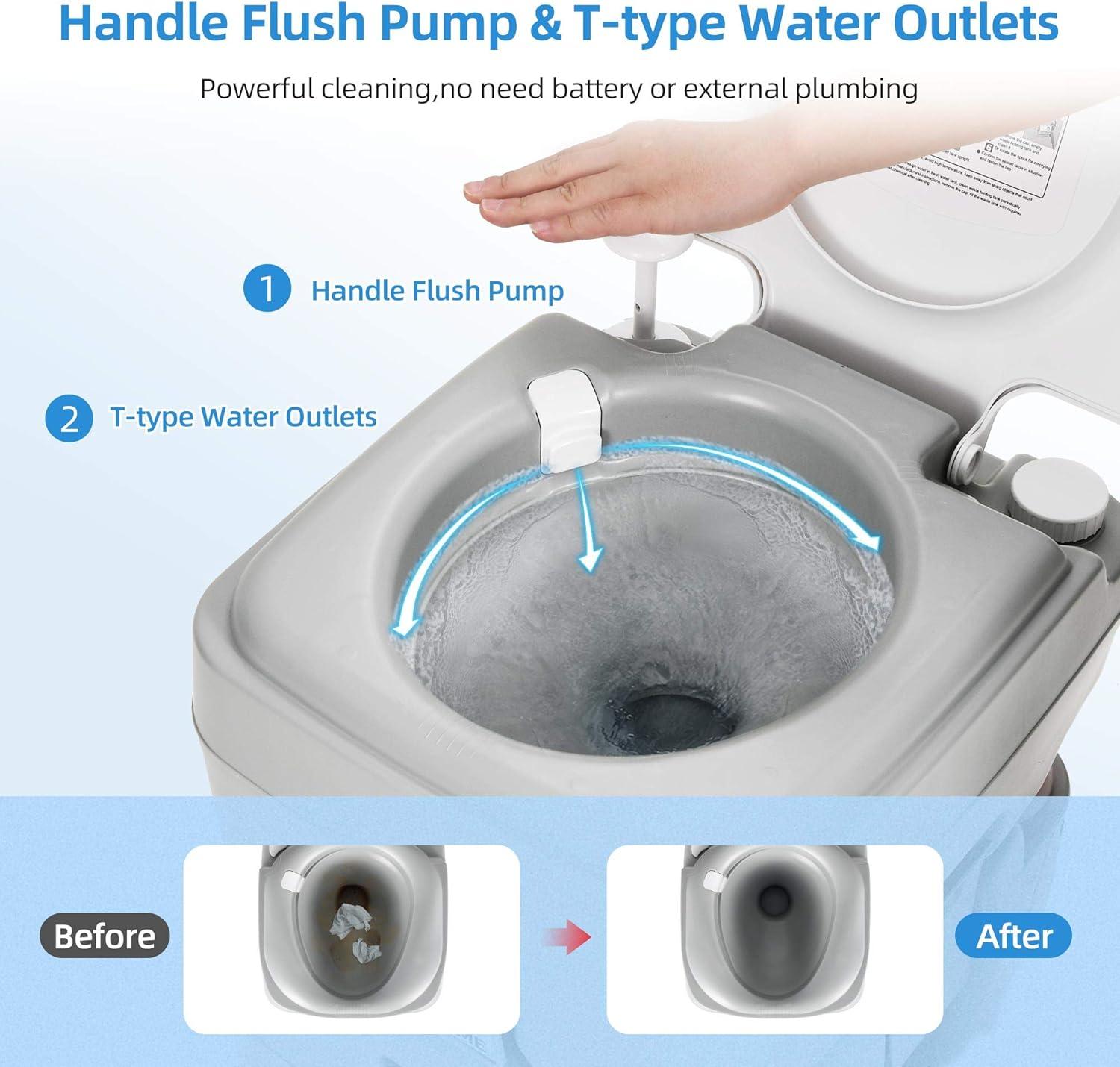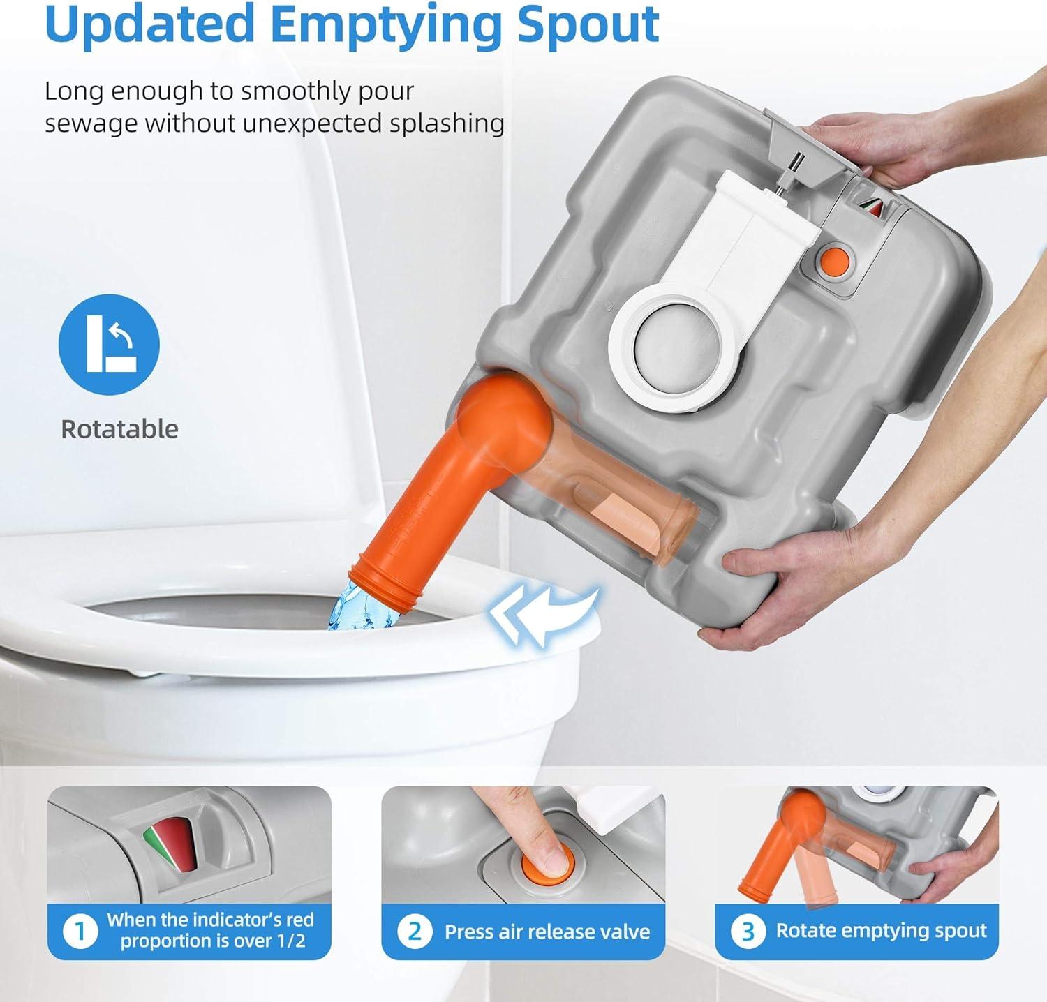 COMPOSTING TOILET: The T-type water outlet of portable toilet can effectively flush the bowl. And the rotating pour spout can help you dump the waste quickly without splashing. The humanized level indicator can remind you to empty the waste tank, when it turns red, which means full-tank waste.