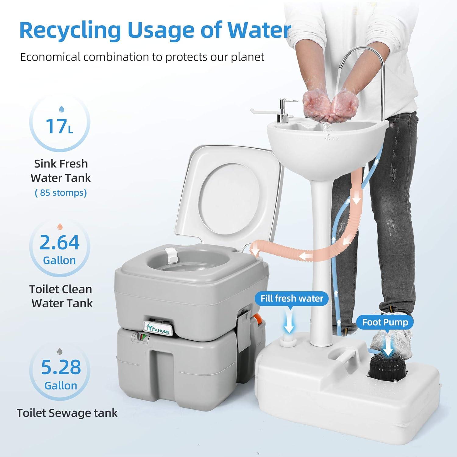 RECYCLING WORKING: The hand washing station provides 4.5 gallon fresh water for washing hands, food or dishes. Then the used water can flow into the fresh water tank of the rv toilet to flush the waste. The combination design can maximize water utilization to be friendly to the environment.