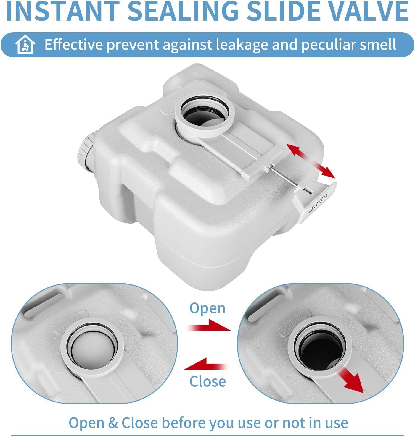 DETACHABLE & STABLE: The camper toilet can be detached using the two side latches to allow for easy disposal of sewage. It also securely fixes the lower part to the ground, providing stability when in use. The slide valve on the toilet can be closed to prevent leakage and odors when not in use.