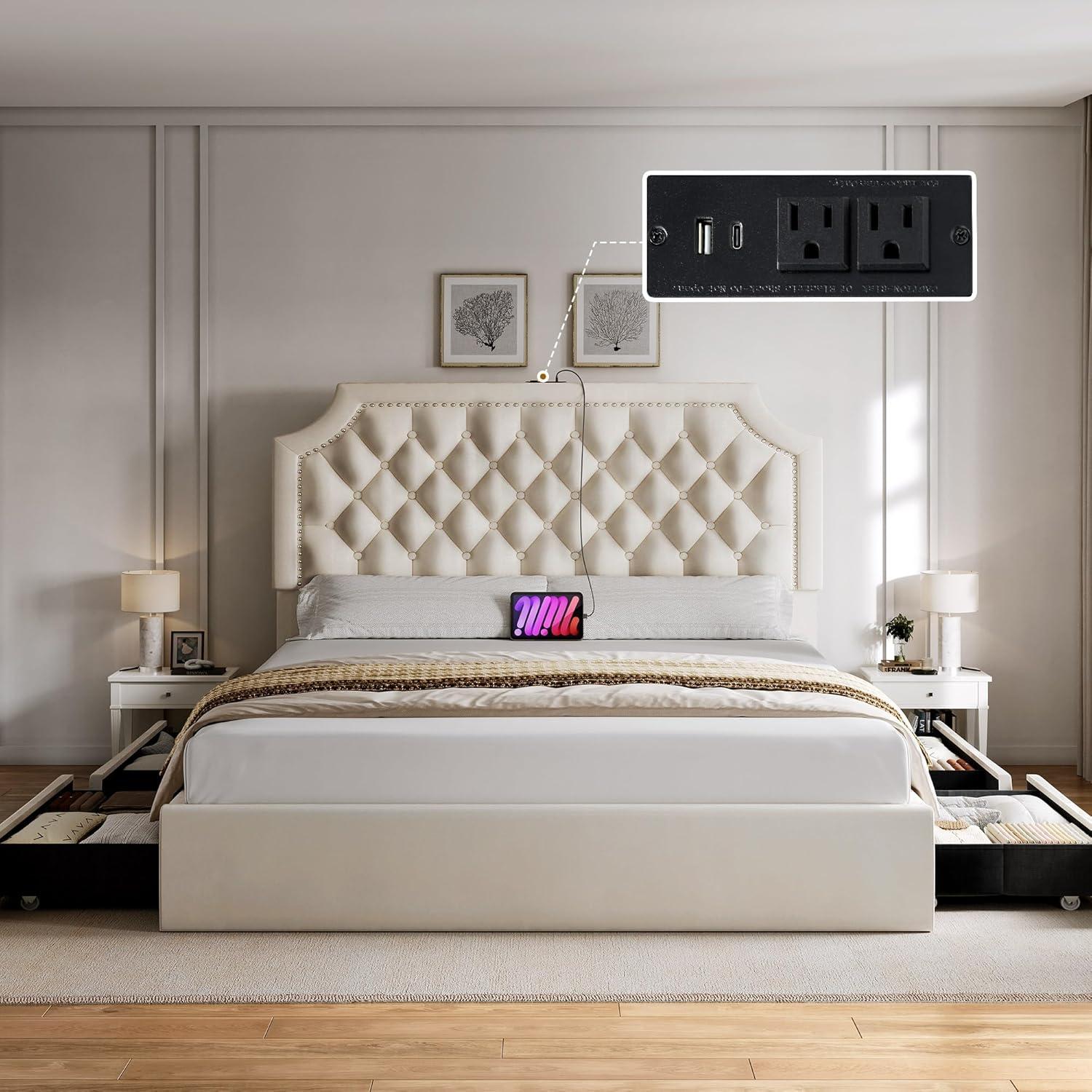 YITAHOME Queen Bed Frame with Bookcase Headboard and 4 Storage Drawers, RGB LED Bed Frame with USB Charging Station Storage Headboard Bed, No Box Spring Needed, Noise Free, Antique White(Beige)