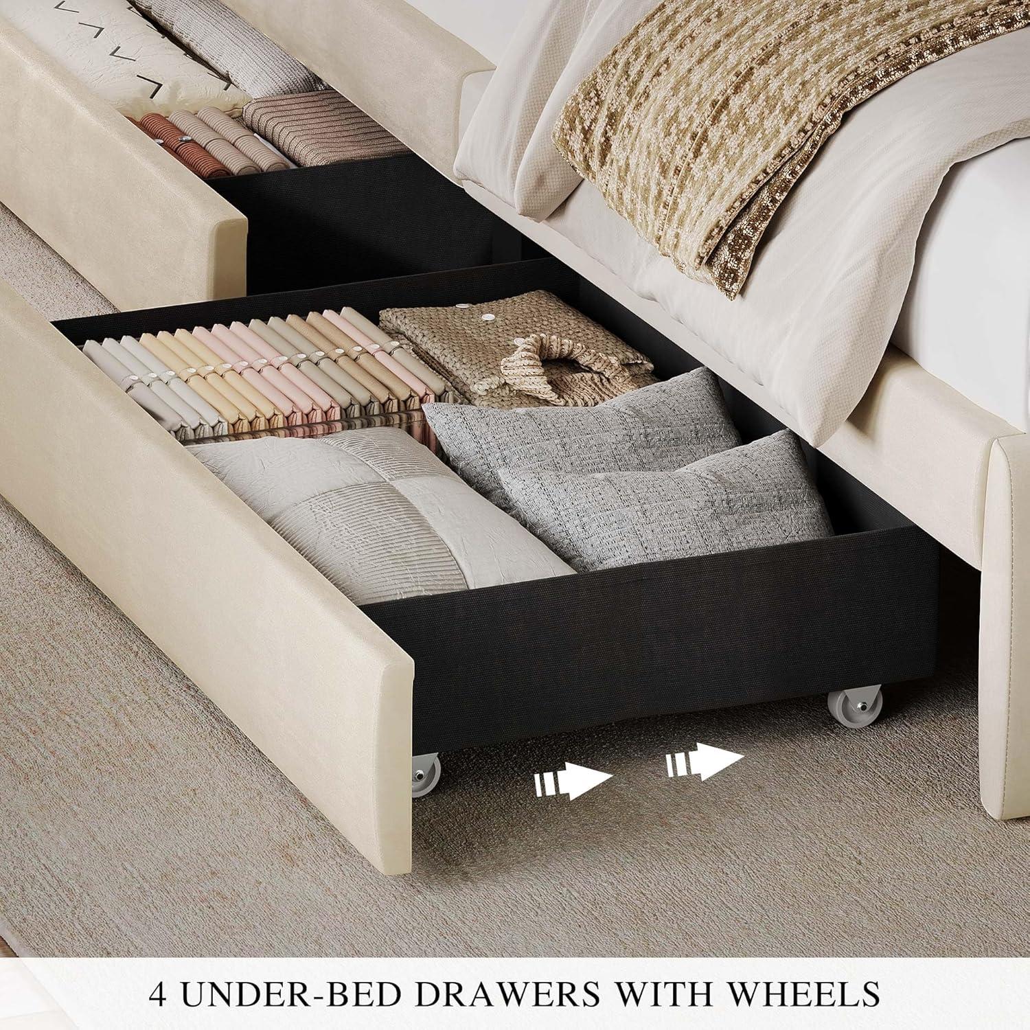 4 STORAGE DRAWERS ON WHEELS – The queen size bed frame comes with 4 under-bed storage drawers for seasonal clothing and bedding, giving you more storage space to keep your bedroom looking clean and tidy. The drawer can be bolted to the bed to prevent it from slipping out.
