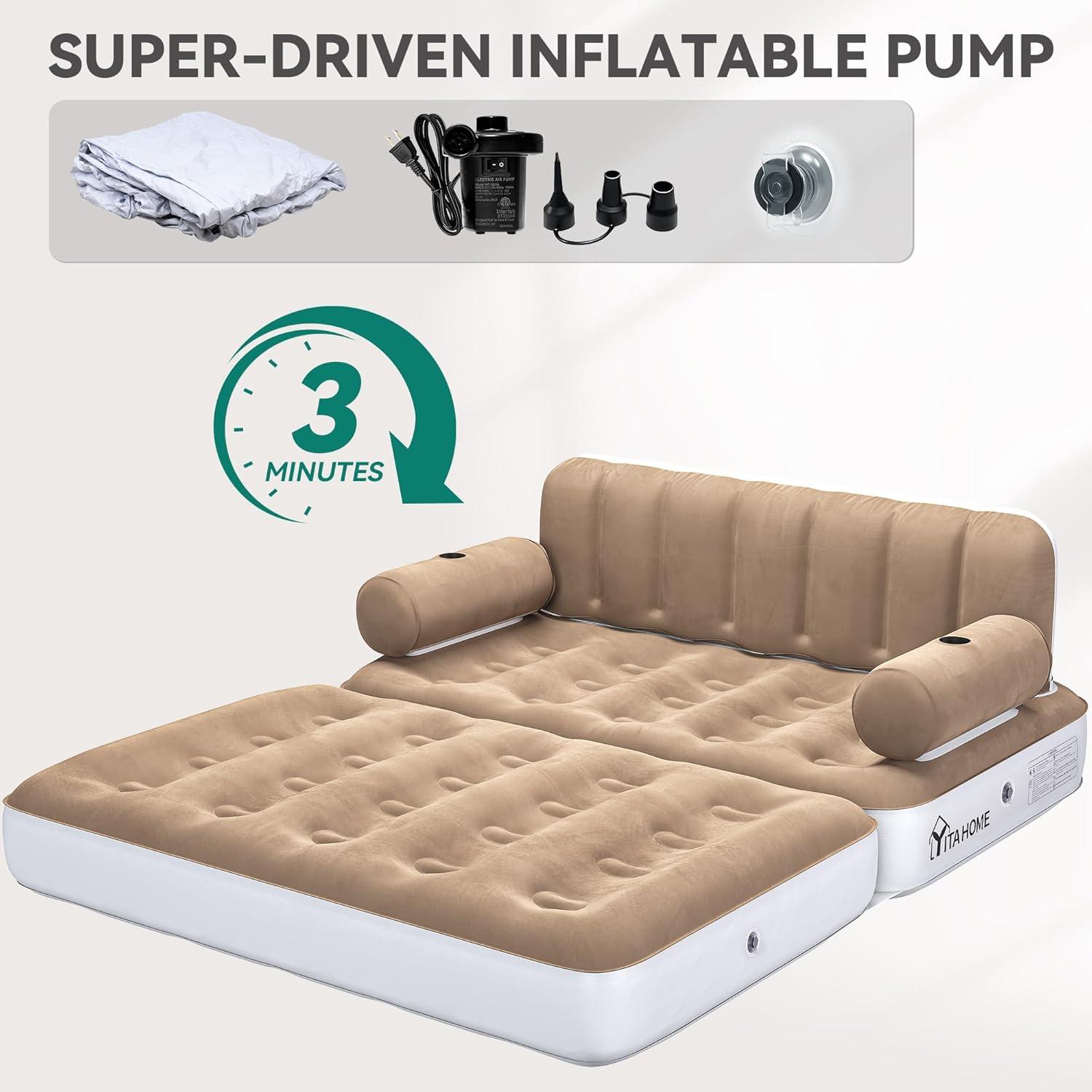 Quick & Easy Inflation: Inflate this air couch in just 3-5 minutes with the included 110V-120V external pump; Deflate with ease using the extra nozzles attached; The pump is also suitable for inflating balloons, inflatable pillows, pool floats, and kayaks