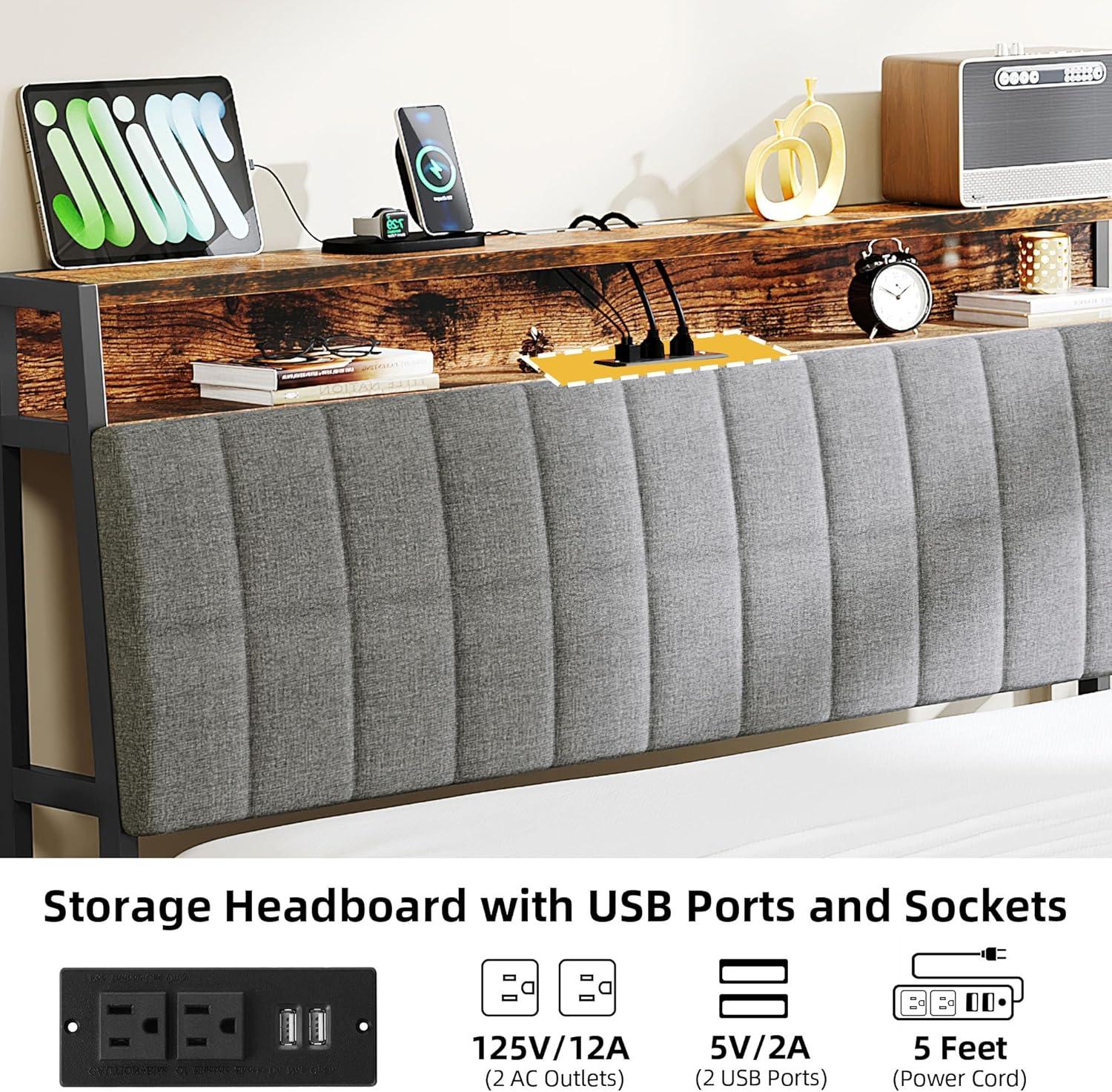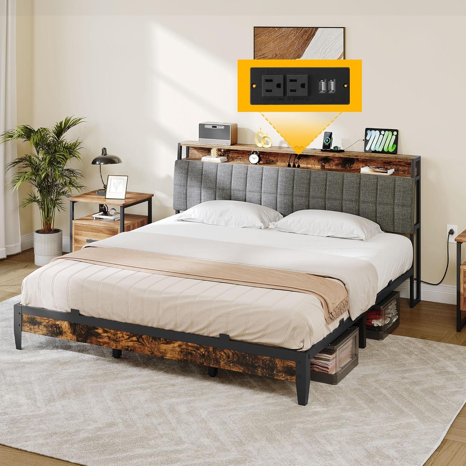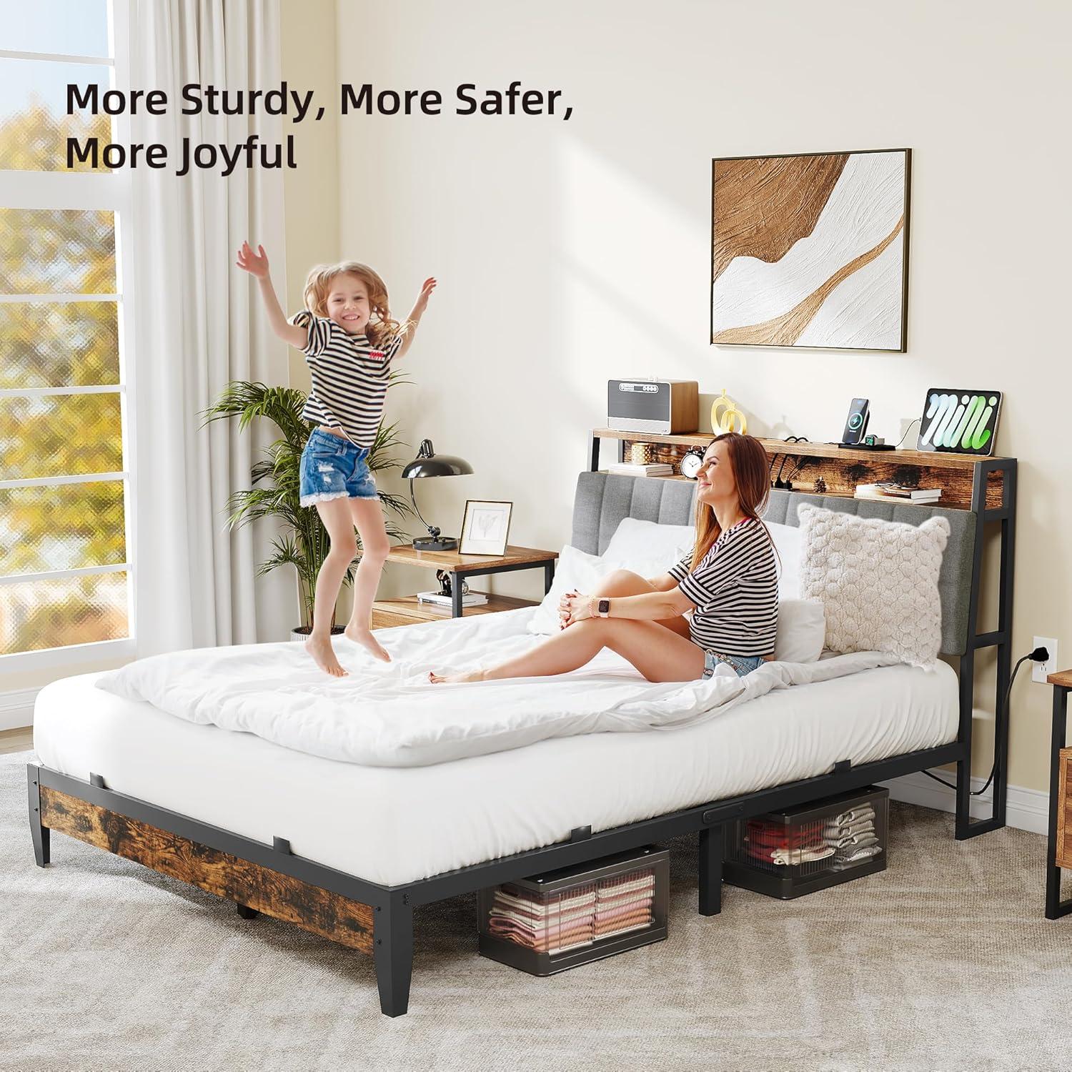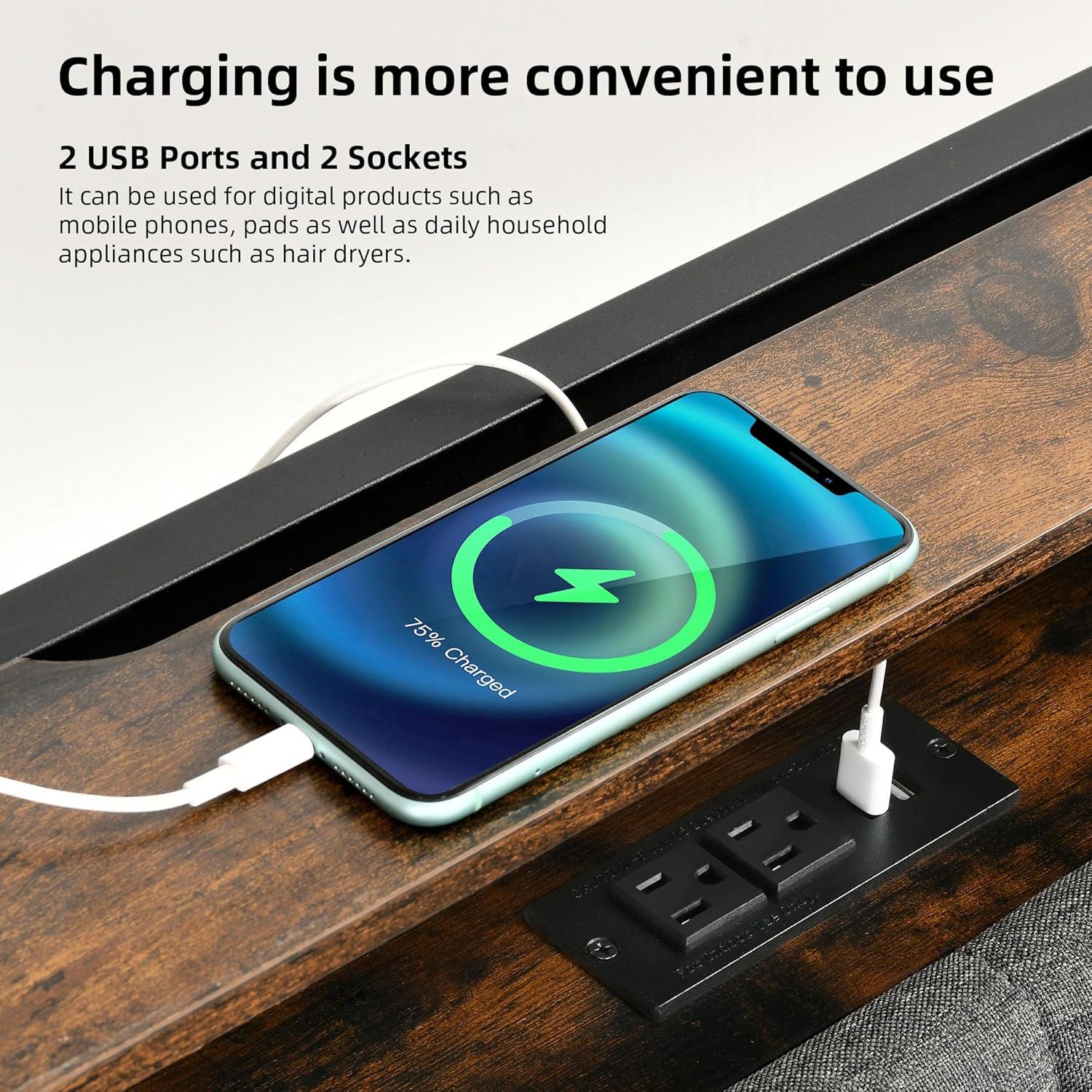 Queen Bed Frame with Charging Station – Metal queen bed frame with 2 sockets, 2 USB ports, and a groove for cables to pass through. Easily charge phone, pad, radio, etc., and keep it within reach without worry about insufficient sockets and cluttered cables.