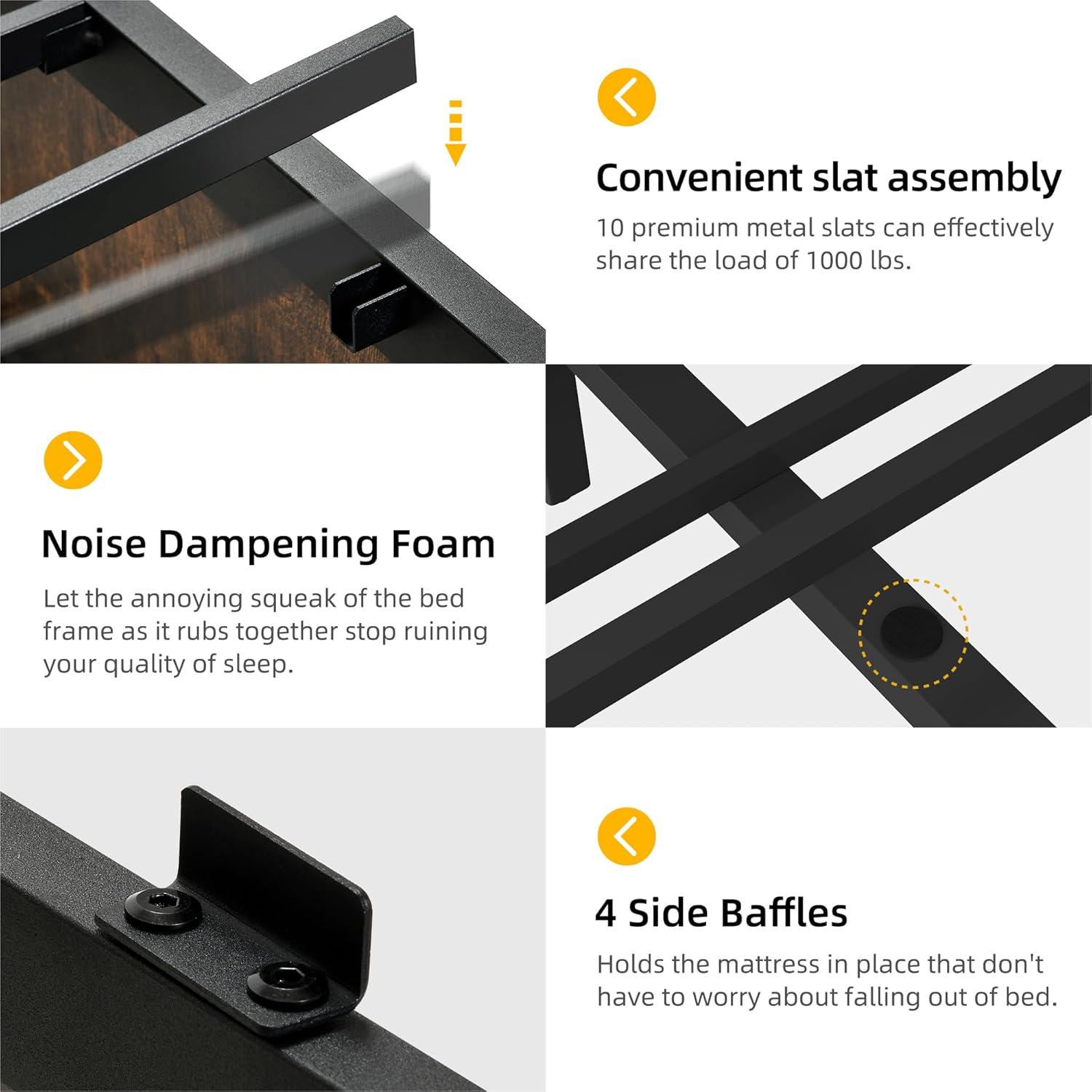 No shaking & No noise – Our bed frame queen size is stable and durable, 12 high-quality metal slats can better carry 1000 lbs over daily needs. Tight structure and sound-deadening foam pads erase the last friction sound and give you a peaceful night.