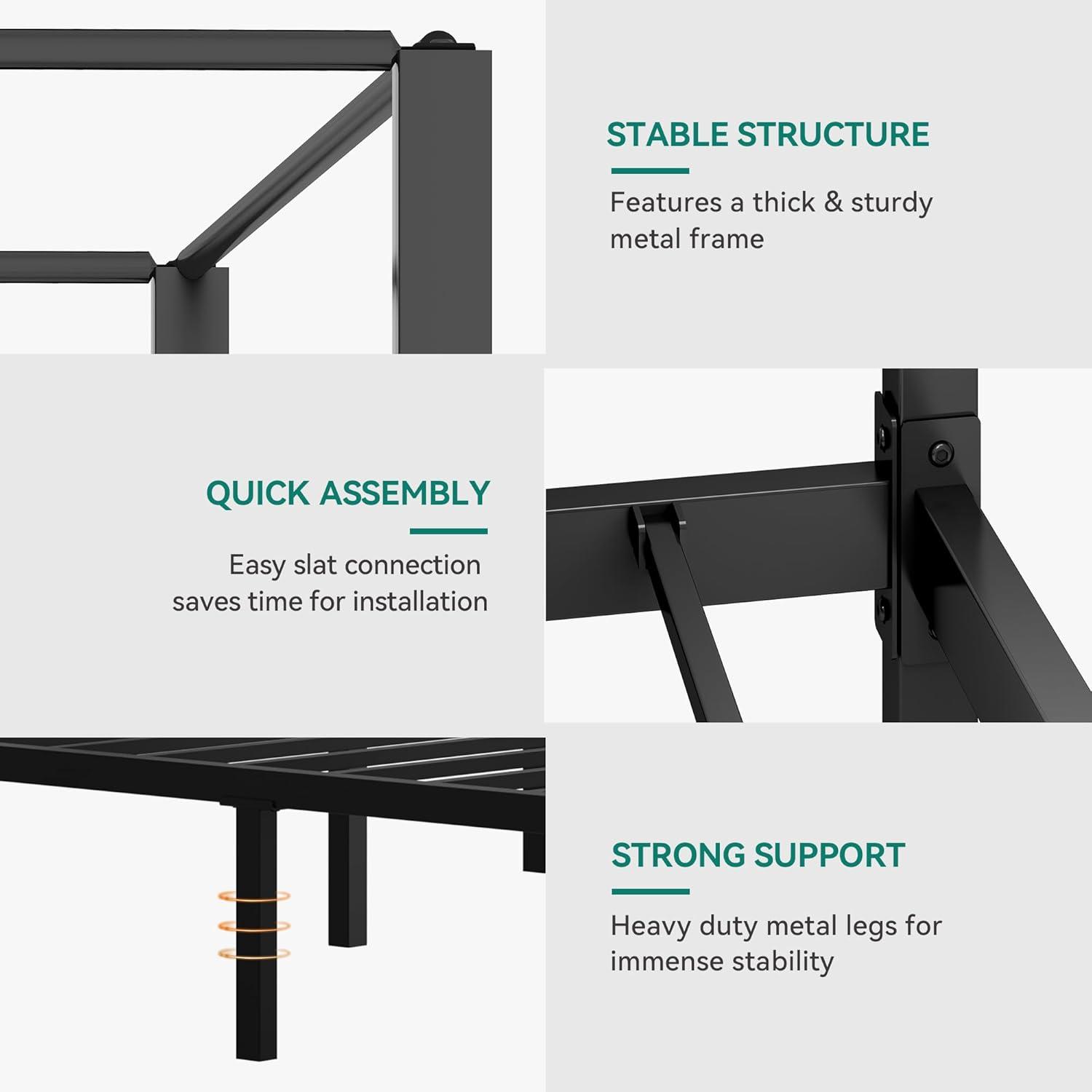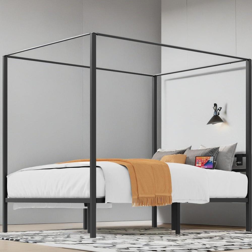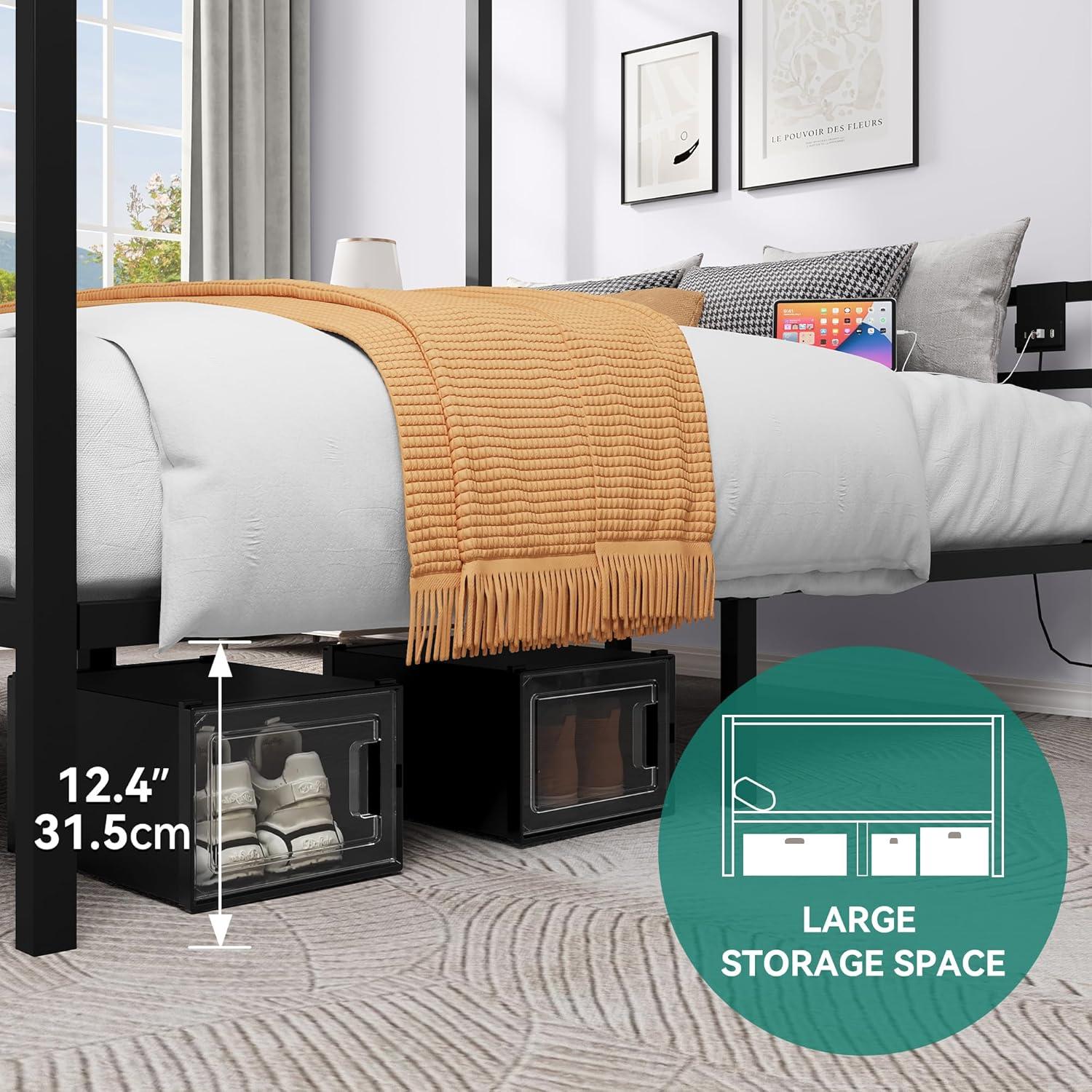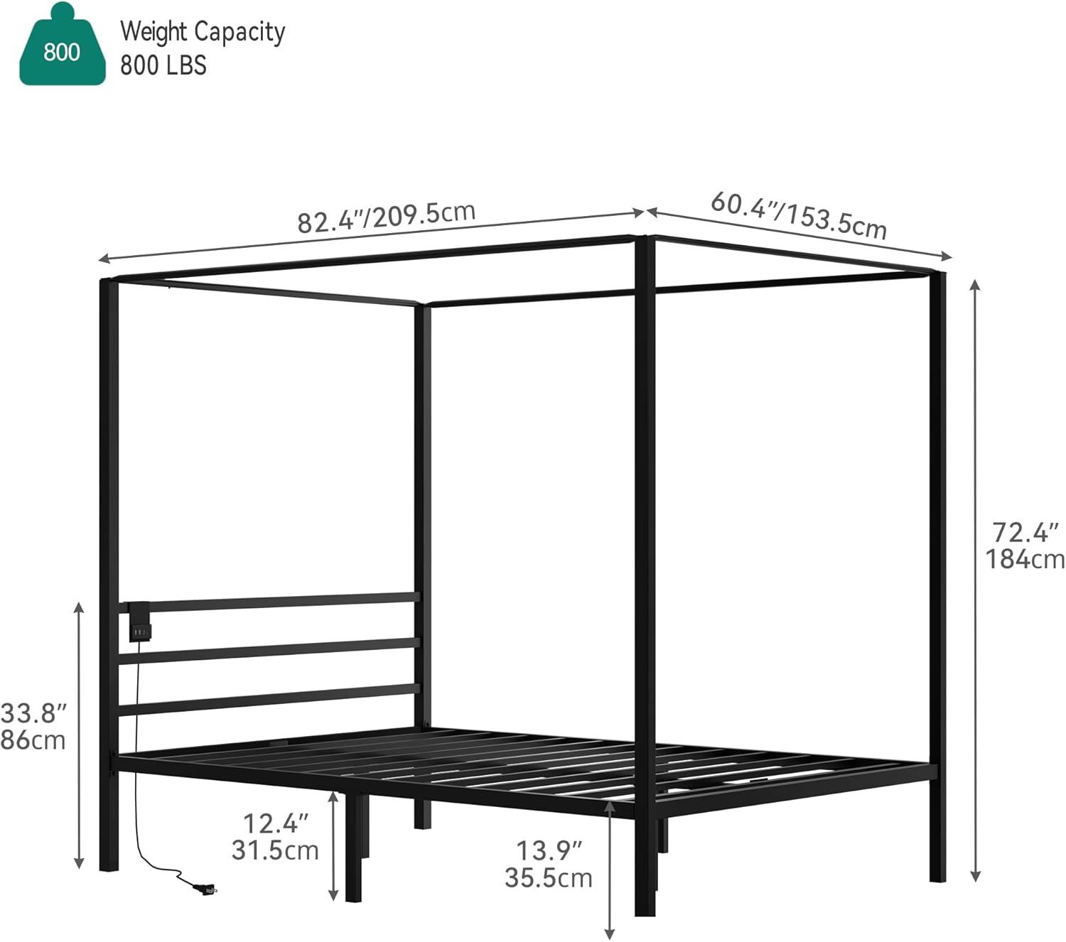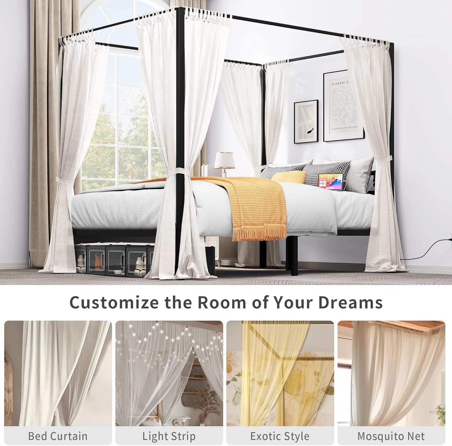 Sturdy Build: Crafted from robust metal, this queen-size bed frame features a four-poster canopy design and reinforced metal slats for optimal support and durability, accommodating up to 800 lbs