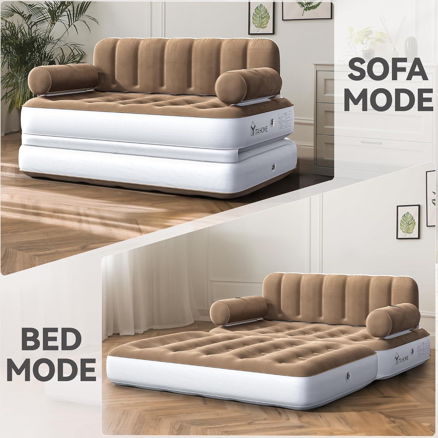 Dual Functionality: Seamlessly switch between a spacious queen-size bed, supporting up to 440 lbs, and a cozy sofa measuring 60.2″ x 39.4″ x 35.6″; This air sofa bed mattress is optimal for both lounging and sleeping, adapting to your needs effortlessly
