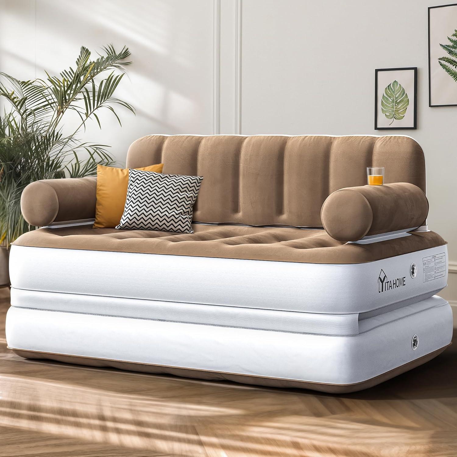 Travel-Friendly Design: Whether at home, on a camping trip, or hosting guests, this blow up mattress sofa bed is your go-to solution; It includes a convenient carry bag for easy transport and built-in cup holders for added practicality