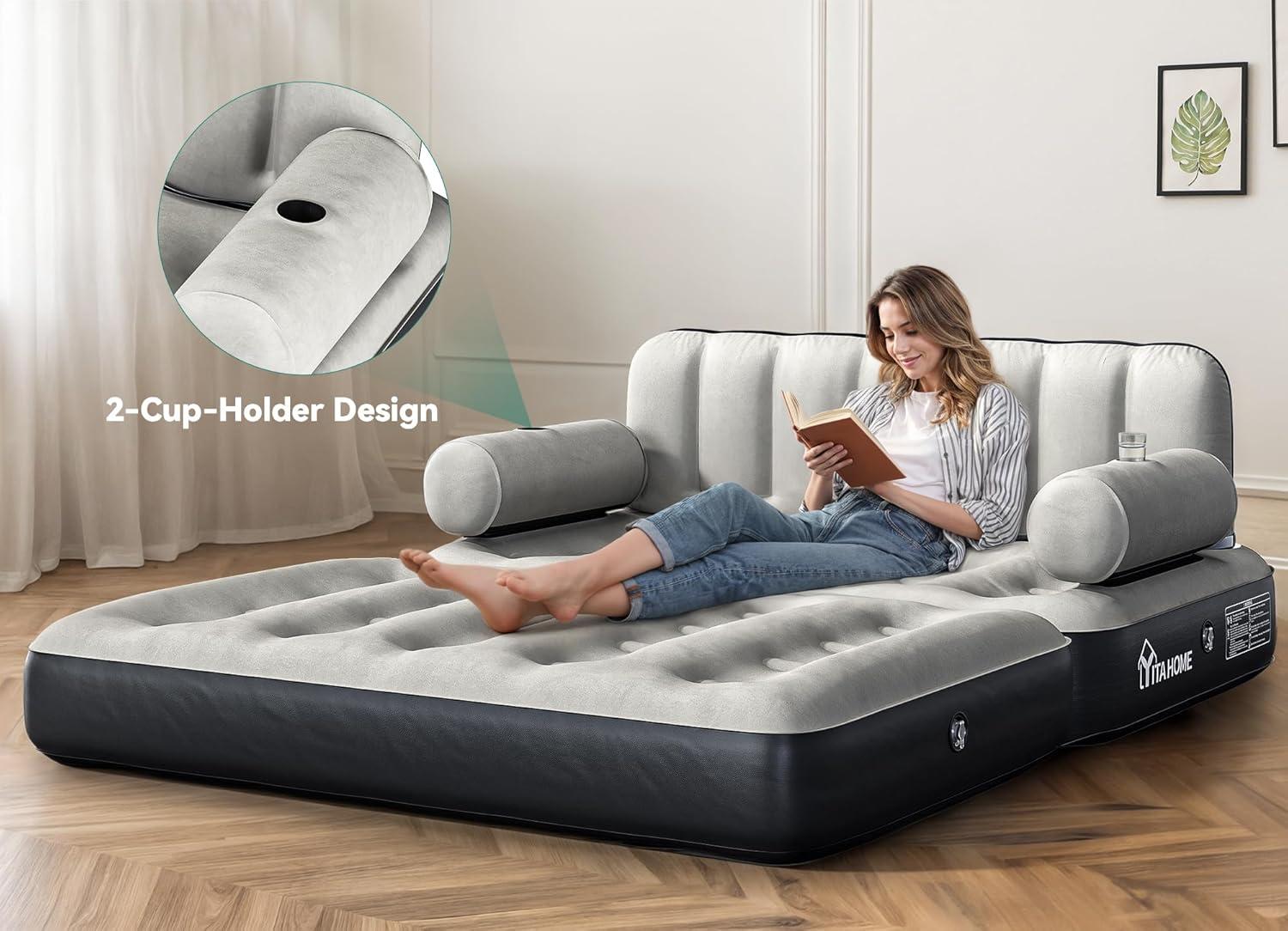 Travel-Friendly Design: Whether at home, on a camping trip, or hosting guests, this blow up mattress sofa bed is your go-to solution; It includes a convenient carry bag for easy transport and built-in cup holders for added practicality