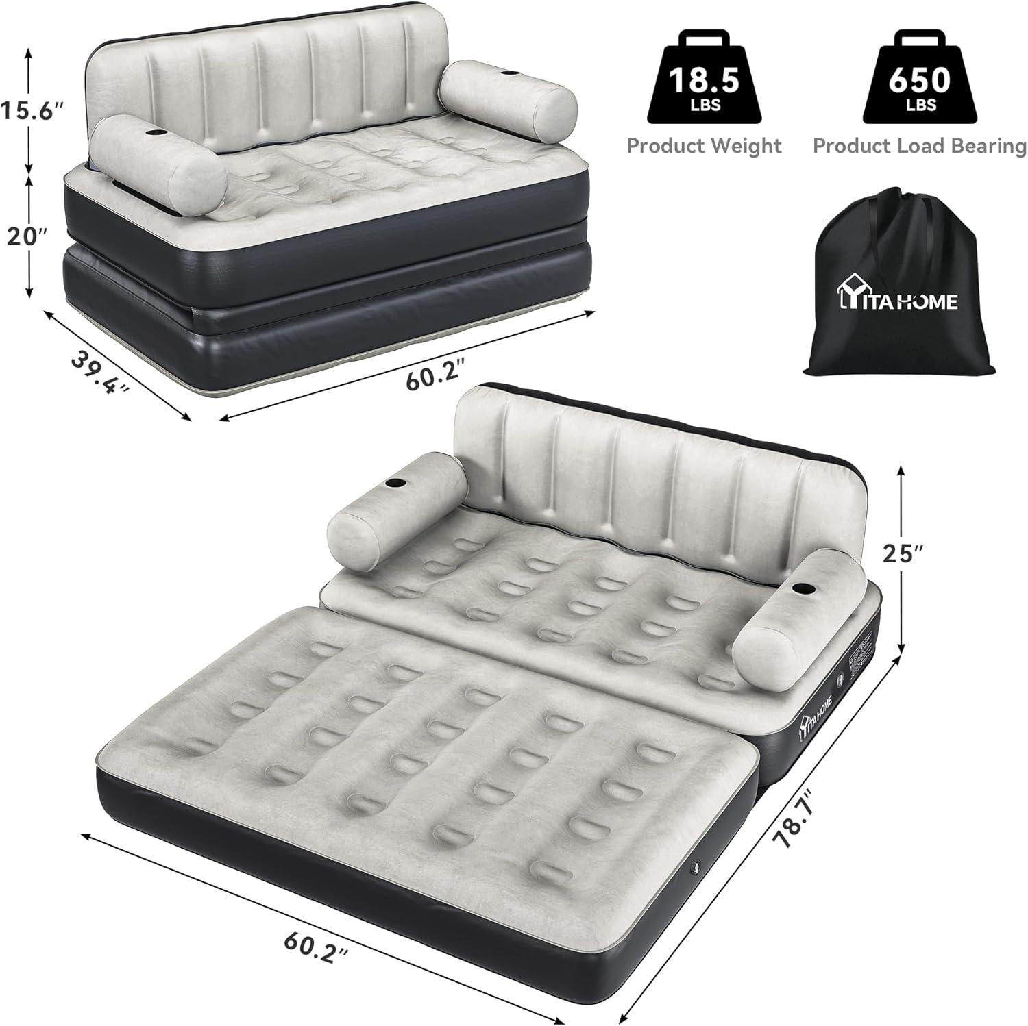 Dual Functionality: Seamlessly switch between a spacious queen-size bed, supporting up to 440 lbs, and a cozy sofa measuring 60.2″ x 39.4″ x 35.6″; This air sofa bed mattress is optimal for both lounging and sleeping, adapting to your needs effortlessly