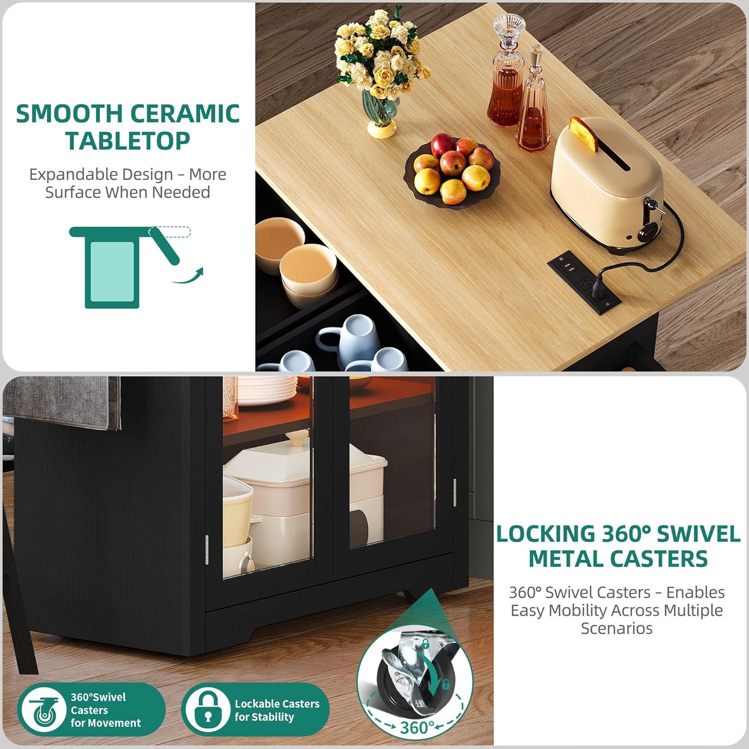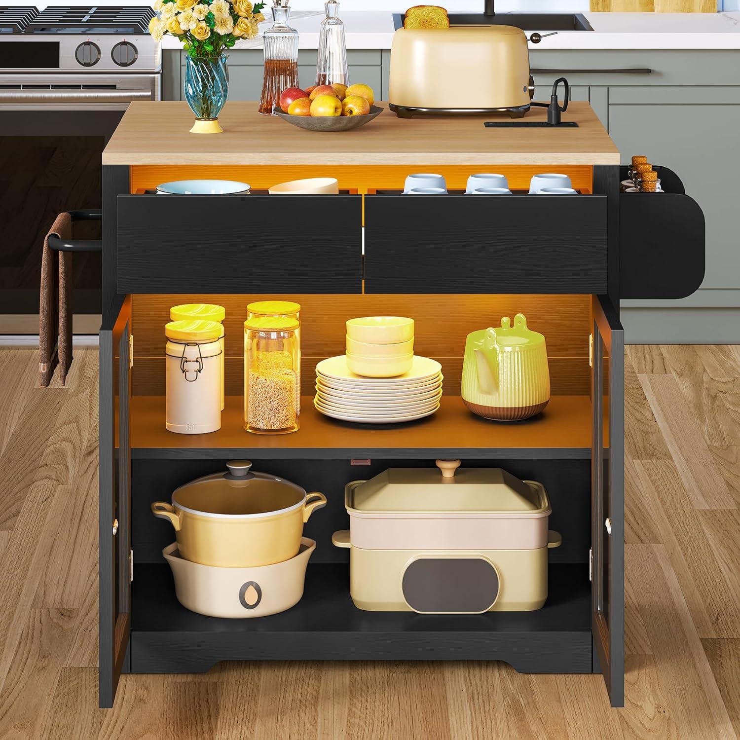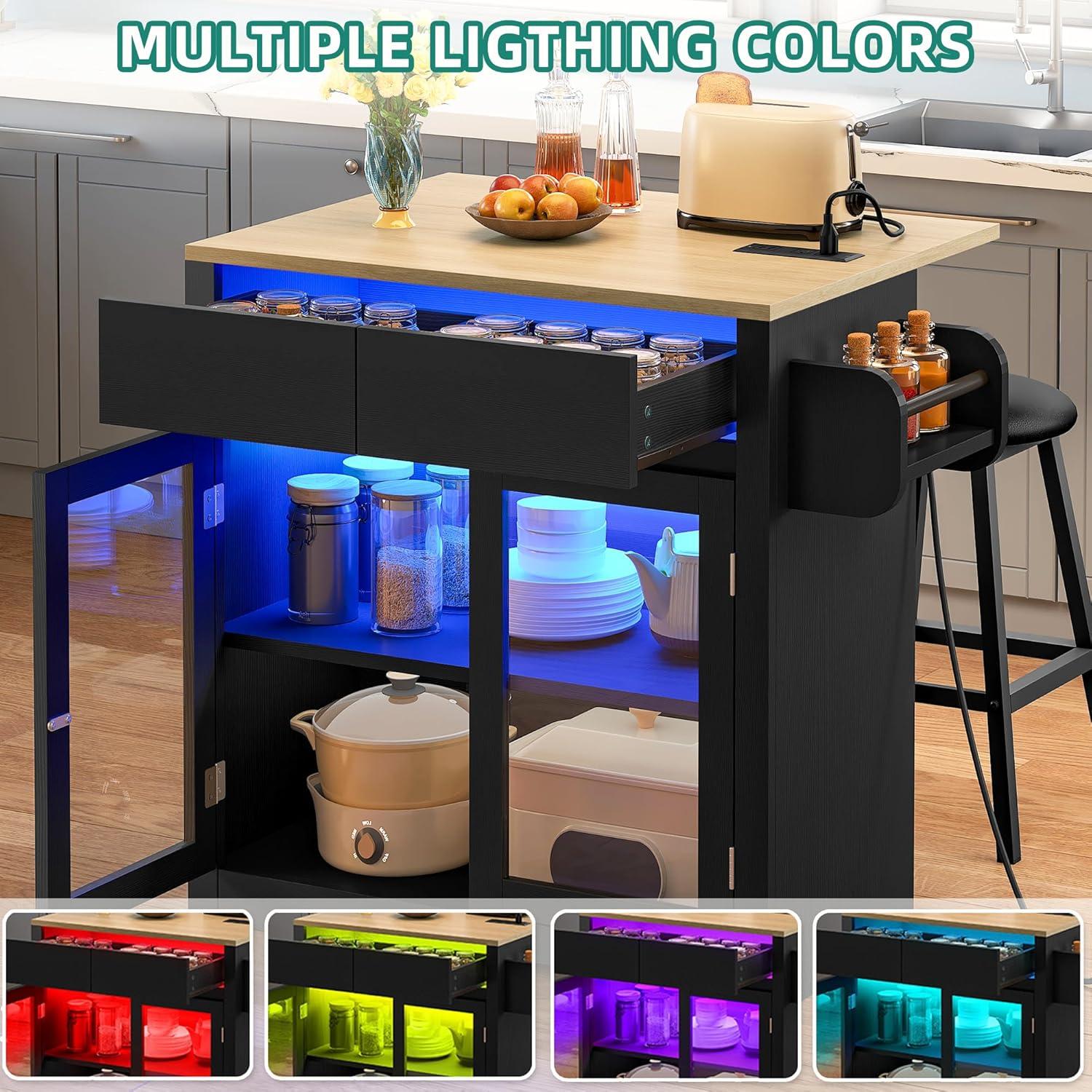 YITAHOME Rolling Kitchen island with Seating and LED Lights, Mobile Storage Islands with Drop Leaf, Dining Table with Power Outlet, 2 Drawers and Soft Stools, Spice/Towel Rack, Lacquered Finish, Black(Black)