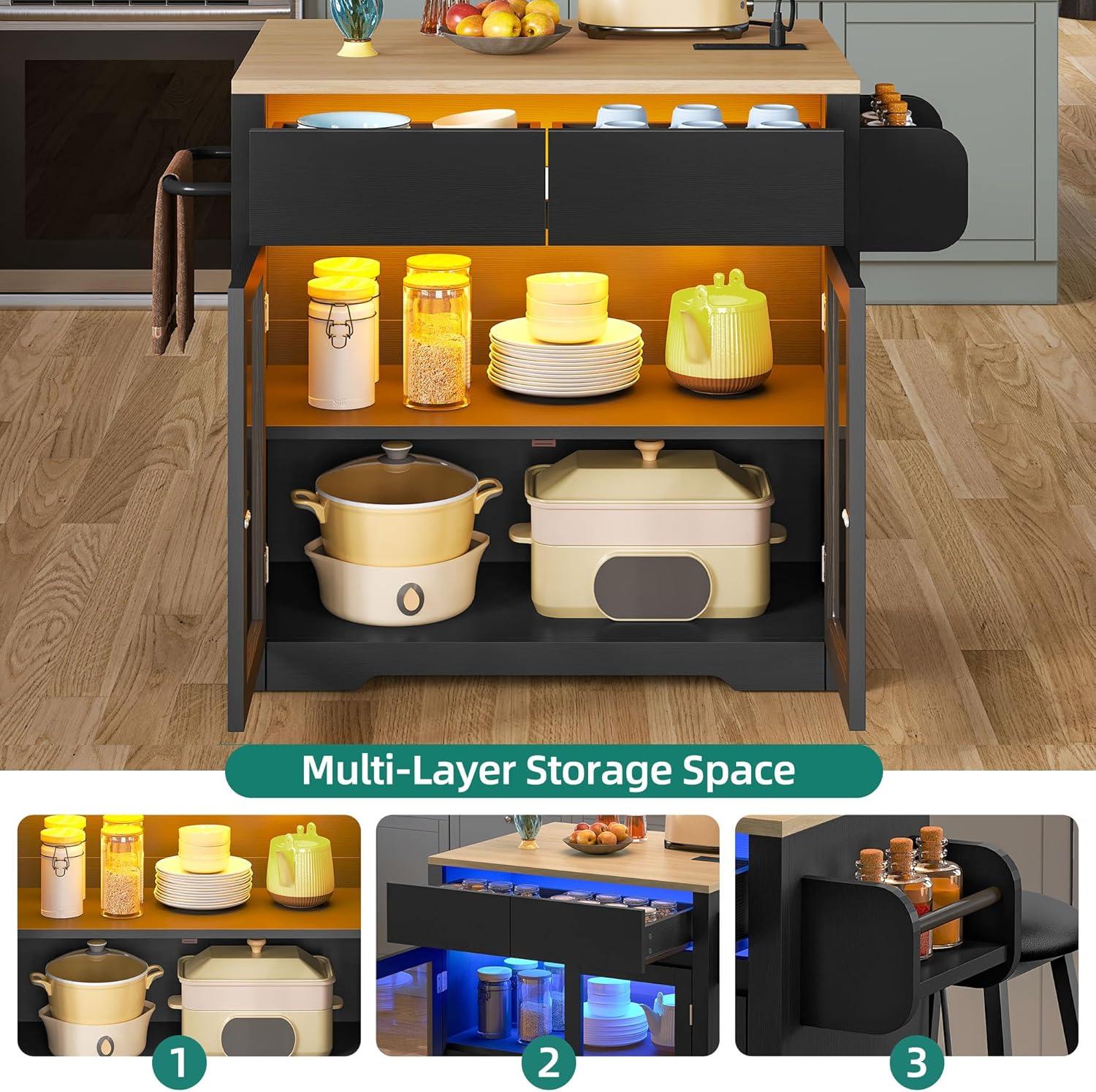 imageYITAHOME Rolling Kitchen island with Seating and LED Lights Mobile Storage Islands with Drop Leaf Dining Table with Power Outlet 2 Drawers and Soft Stools SpiceTowel Rack Lacquered Finish BlackBlack