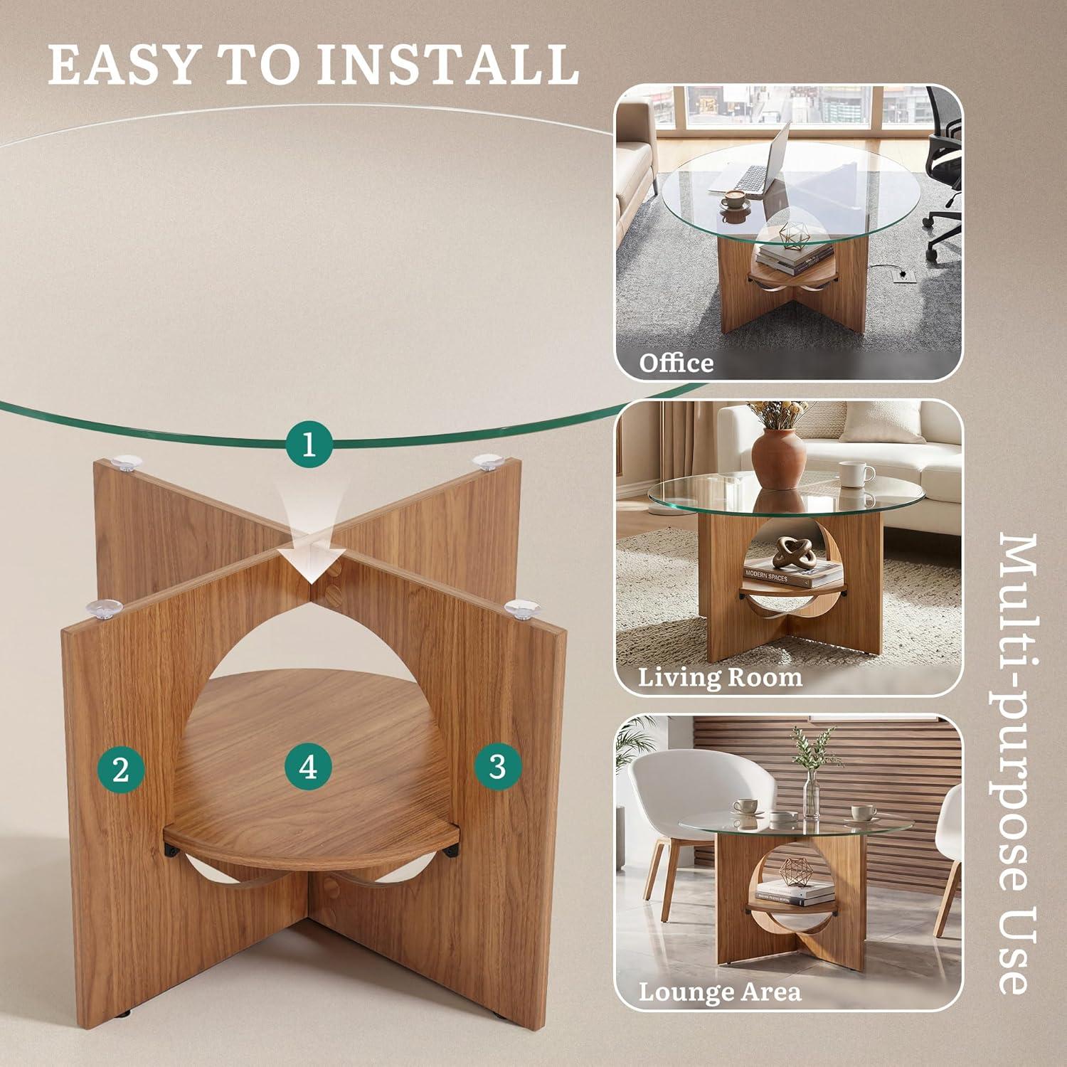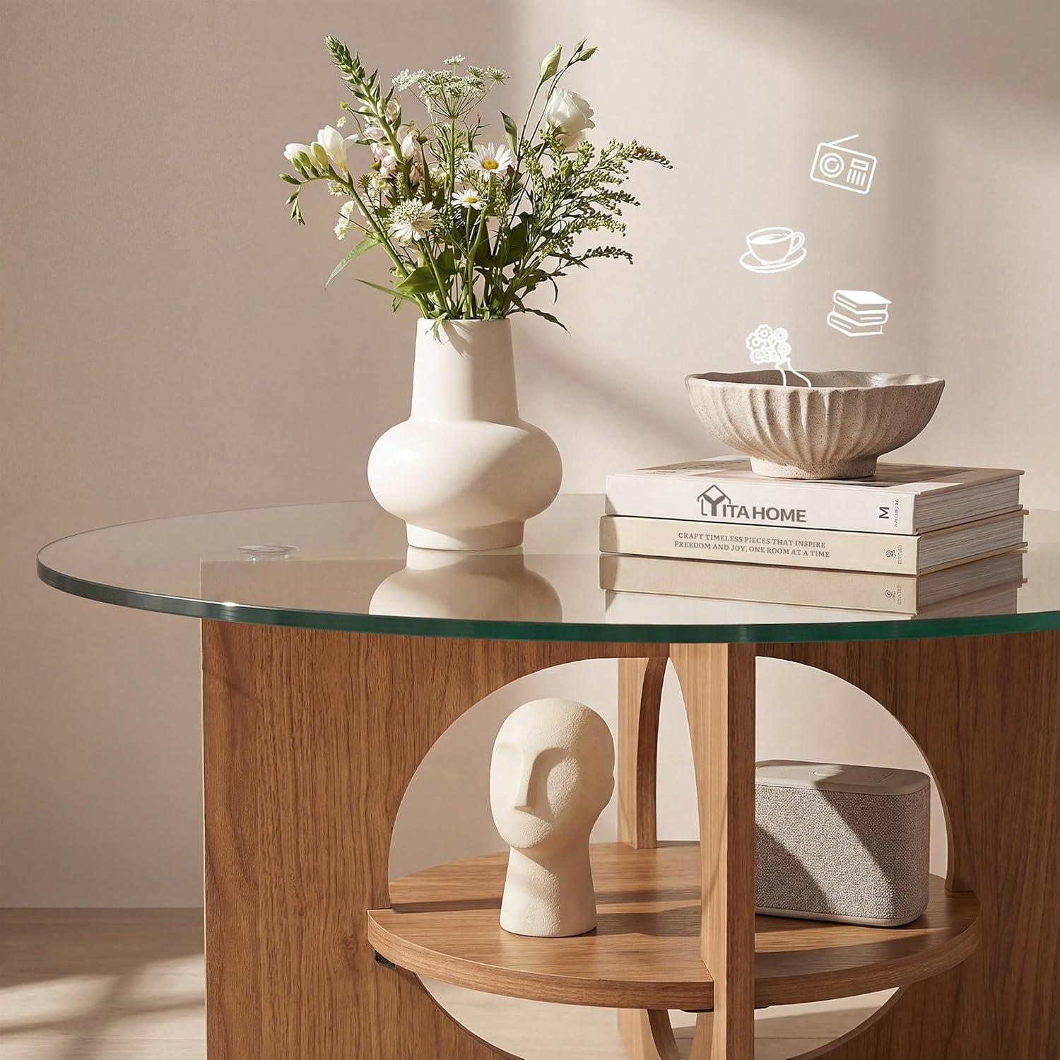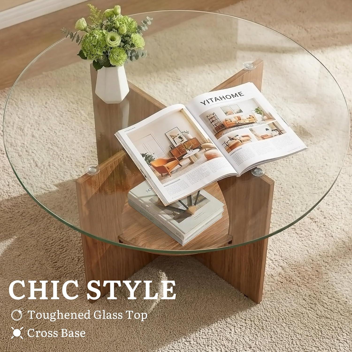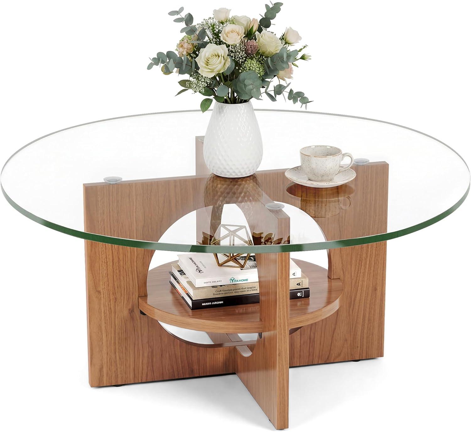 YITAHOME Round Coffee Table, 2-Tier Glass Coffee Tables with Storage, Multi-Purpose Modern Center Table or Cocktail Table for Living Room, Office, Lounge, Walnut(White Oak)