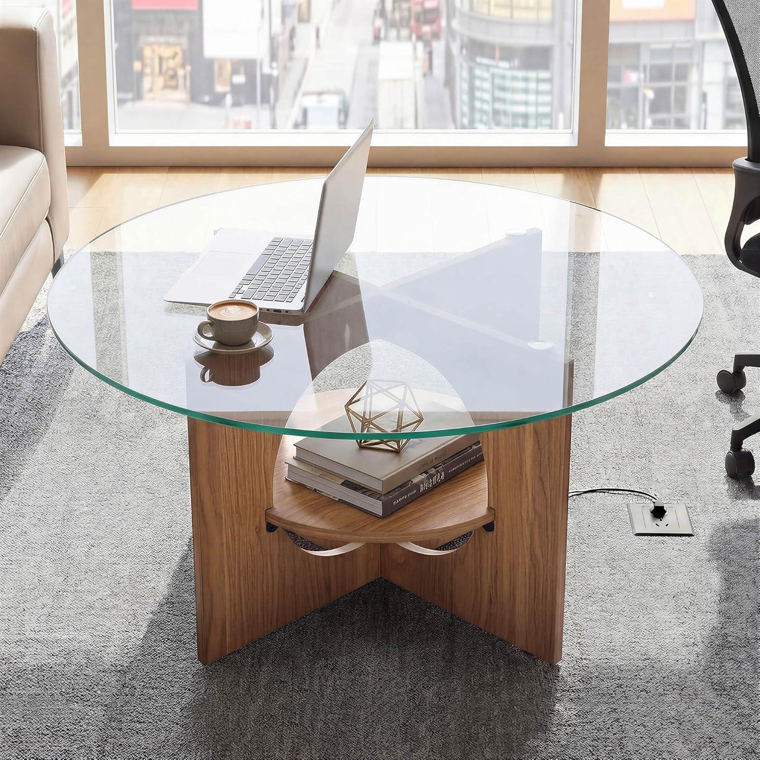 YITAHOME Round Coffee Table, 2-Tier Glass Coffee Tables with Storage, Multi-Purpose Modern Center Table or Cocktail Table for Living Room, Office, Lounge, Walnut(Walnut)