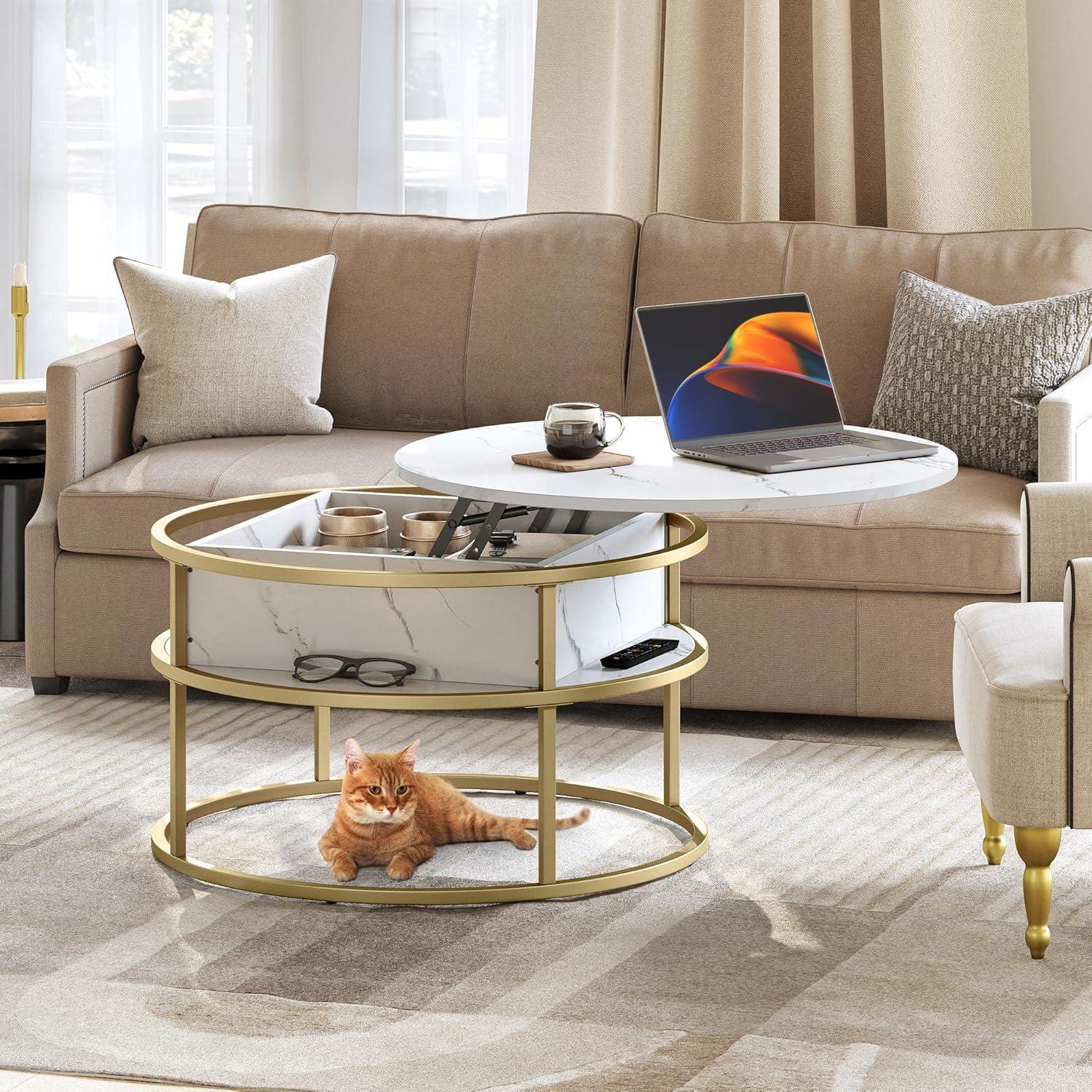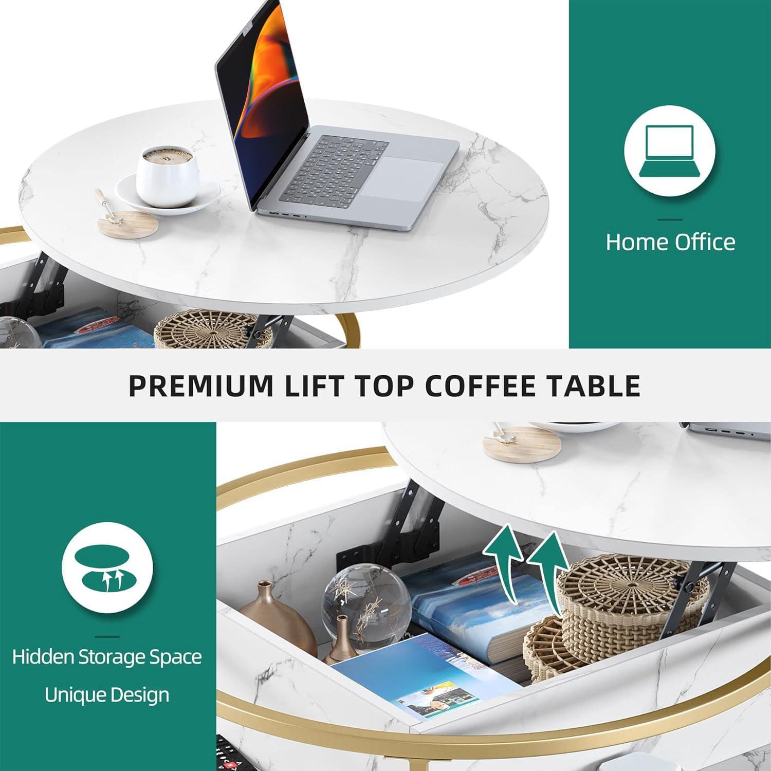 YITAHOME Round Lift Top Coffee Tables for Living Room with Hidden Storage Compartment, Modern Grey Coffee Table with Storage 2 Tiers for Home Decor Office Round Center Tables Living Room Table, Grey(Marble and Gold)