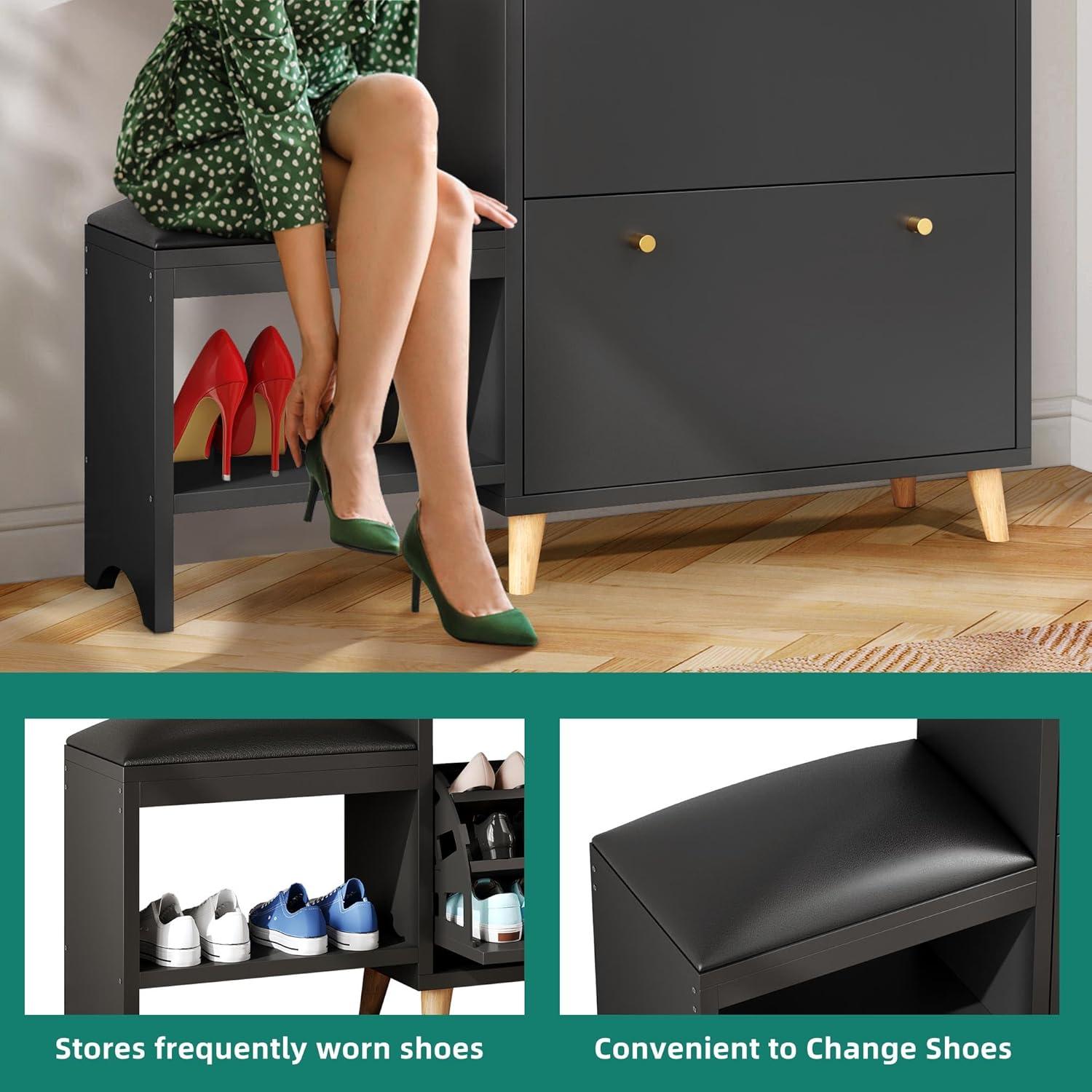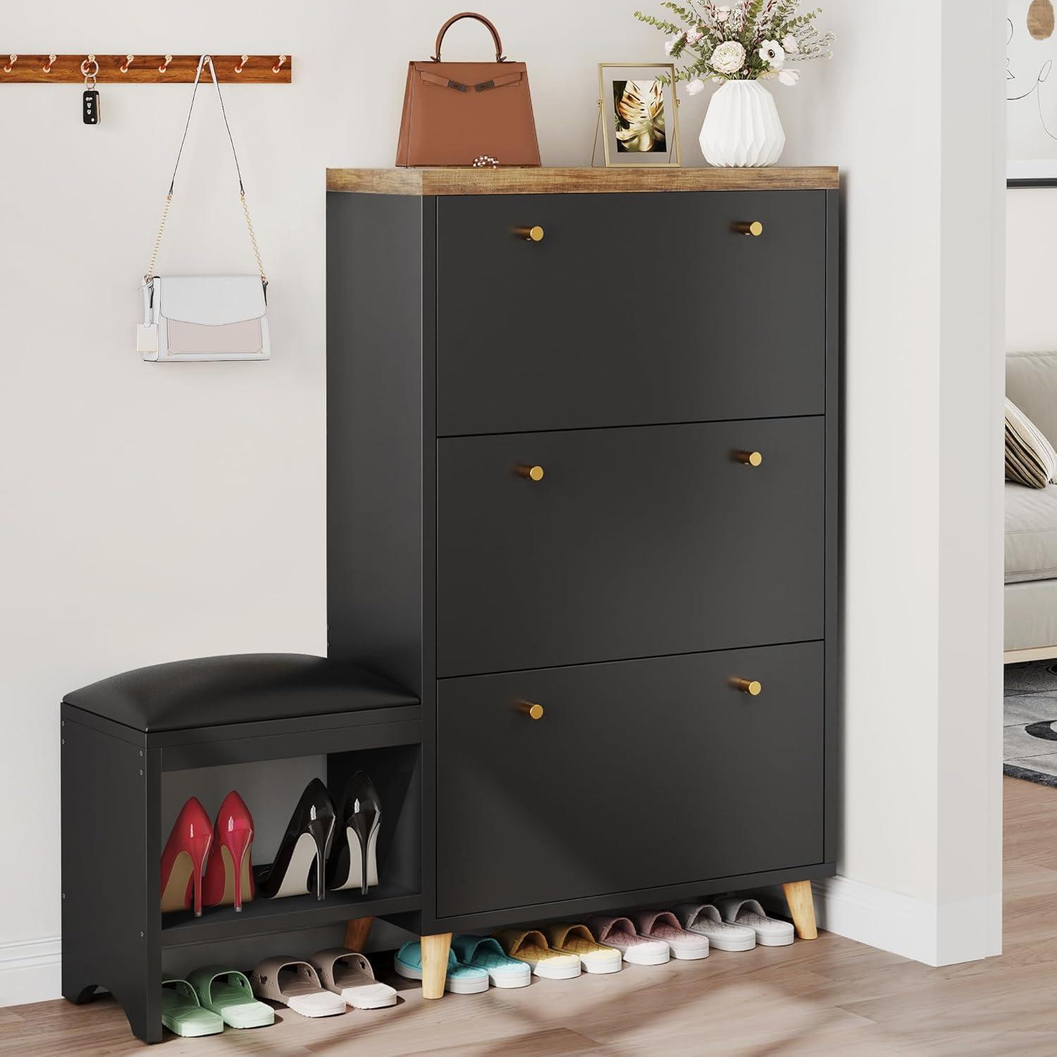 Space-saving Shoe Cabinet: YITAHOME shoe storage cabinet features 3 flip drawers(Each drawer can hold about 6KG), 1 top shelf and shoe bench for 27 pairs of shoes. It is a great storage solution to eliminate messy piles of shoes in closets and entryways.