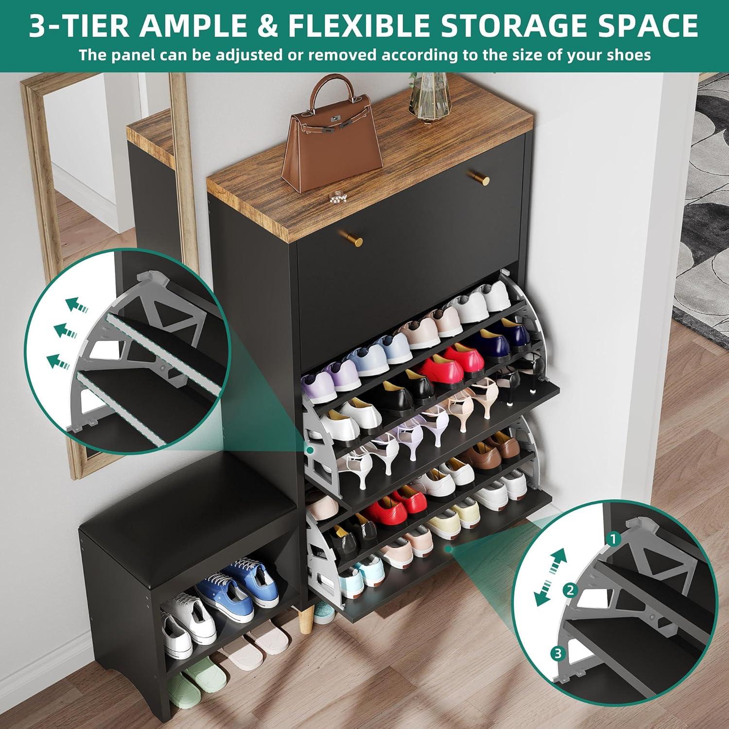 Keep Your Shoes Tidy: 3 spacious flip drawers can hold up to 27 pairs of shoes (depending on the size) to keep them organized and protected from dust. Also, the 3-position adjustable & removable dividers make it easy to fit all of your shoes.