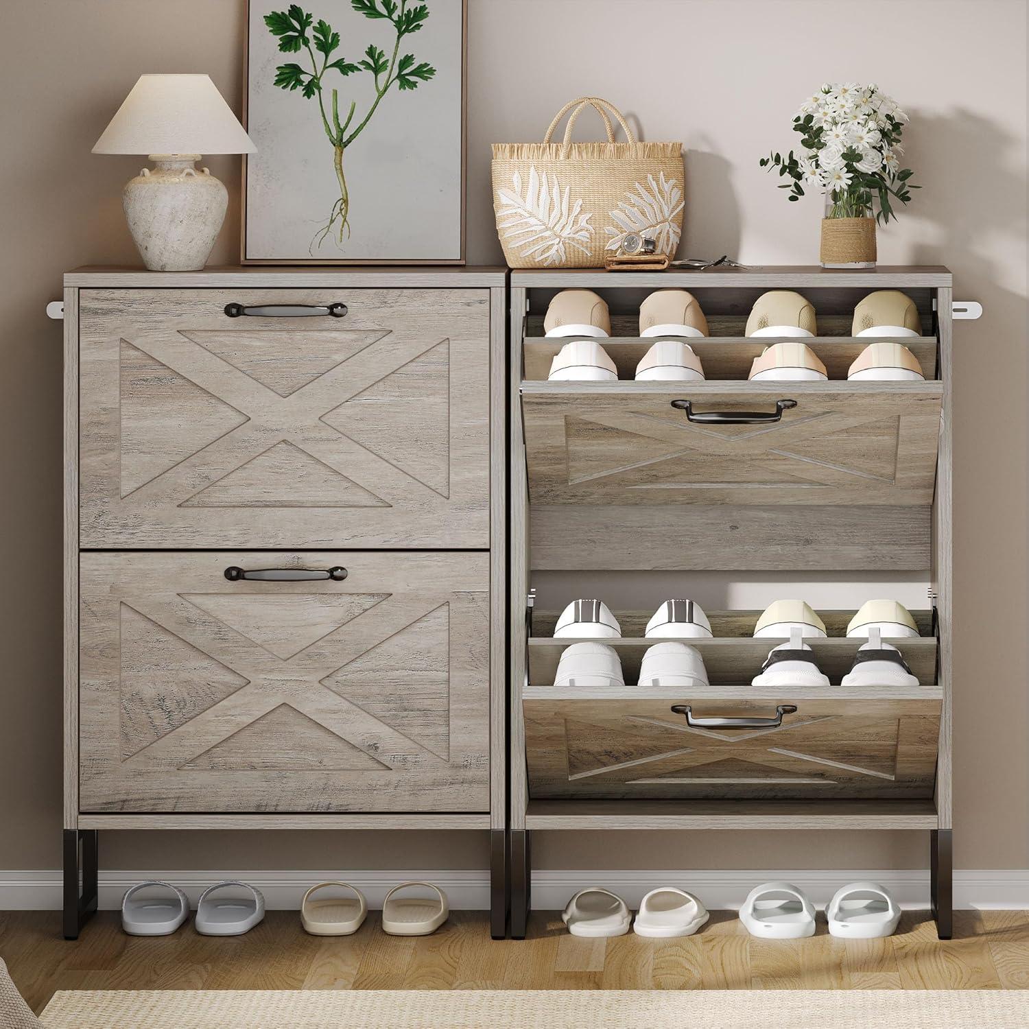 Exquisite shoe cabinet: Step into style with our entryway shoe storage cabinet! This rustic brown beauty adds a touch of elegance to any space. Whether it's your entryway, hallway, living room, or porch, this narrow shoe cabinet brings both organization and charm to your home. Each flip drawer can hold up to 4 to 6 pairs of size 8 shoes at most.