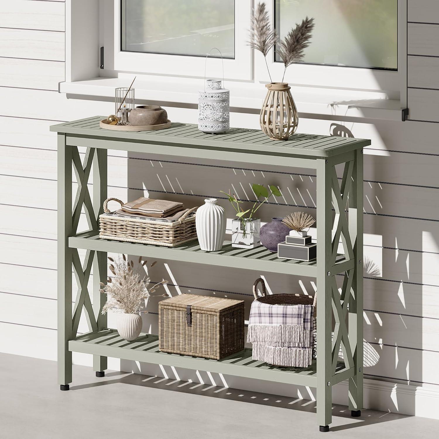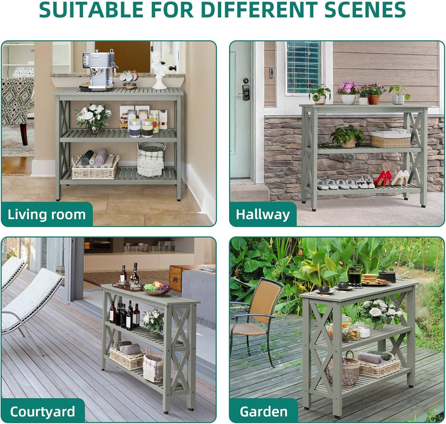 Stable and Clean Design: Featuring an X-shaped side frame for stability, this outdoor storage table includes slatted shelves that promote airflow and drain excess water in outdoor settings. The open design prevents clutter, creating a refined, polished space