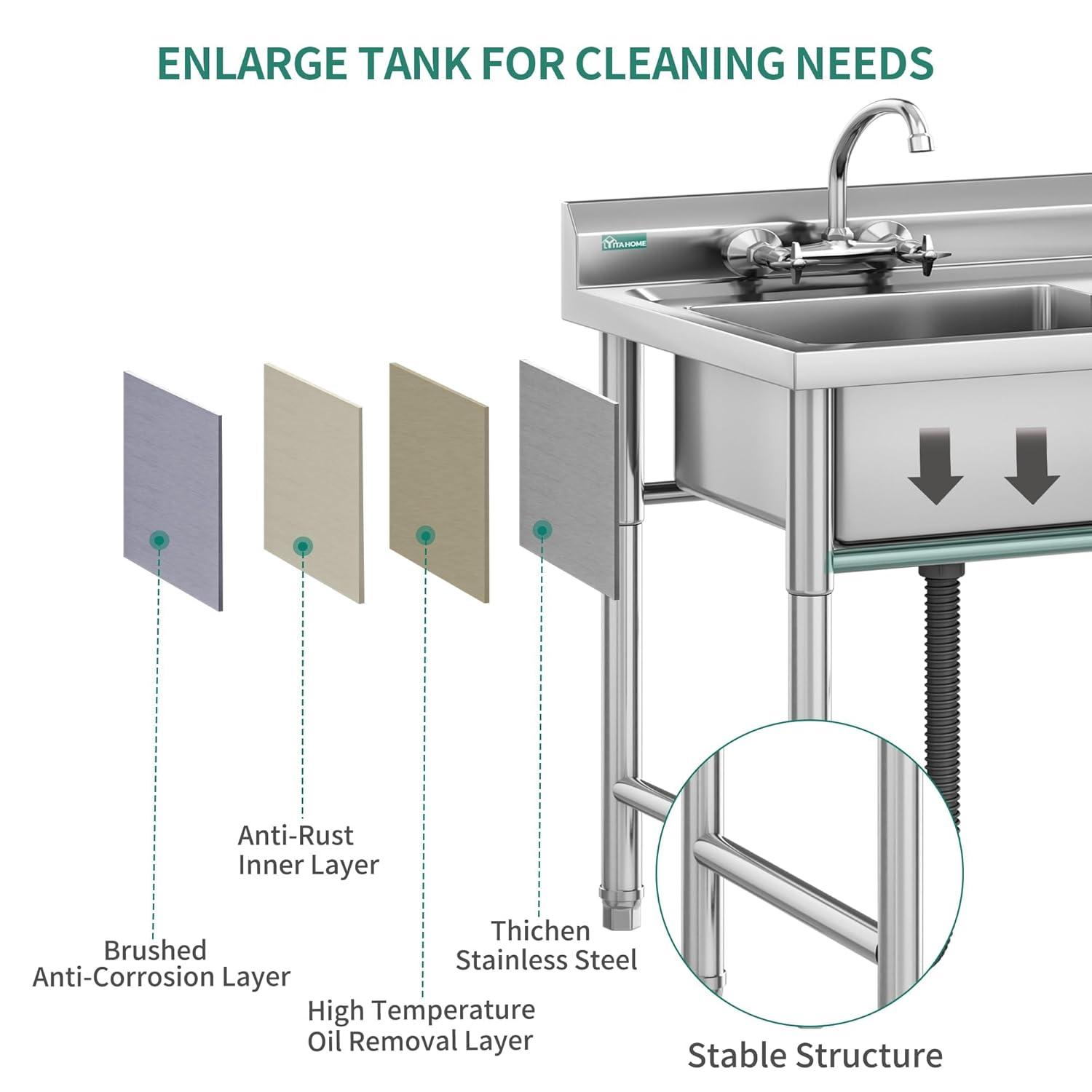 Sturdy construction: featuring a solid structure and reinforced bracket base, the commercial sink provides stability and expanded storage space. the spacious 16.34″w area on the left side is ideal for accommodating a wheeled cart, providing Versatile storage options both indoors and outdoors
