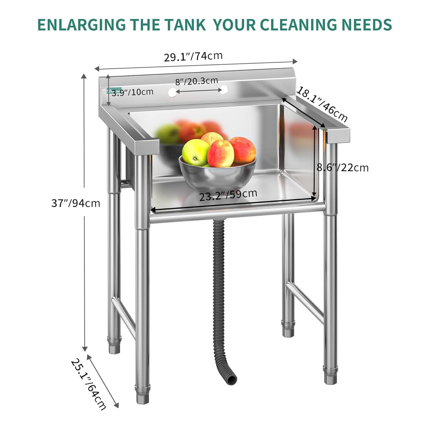 practicable size: the utility stainless steel sink size is 49.8″ w x 18.5″ d x 39.8″ h. bowl size 17″ w x 13″ d x 7.9″ h the large-capacity utility sink includes a 3 1/2″ stainless steel basket strainer, preventing clogs and leaks by collecting food and debris; the commercial stainless steel sink with legs is easy to assemble in just 10 minutes
