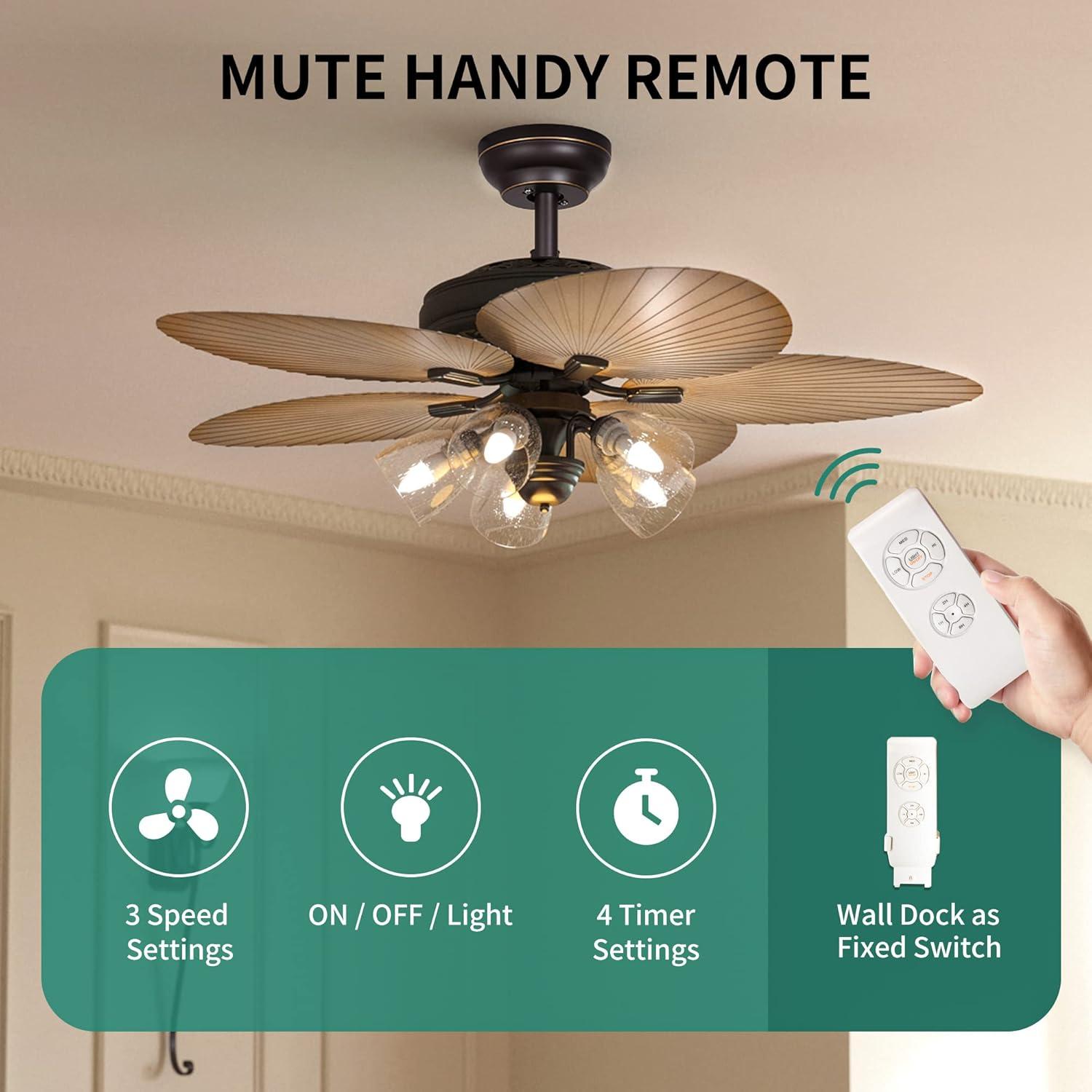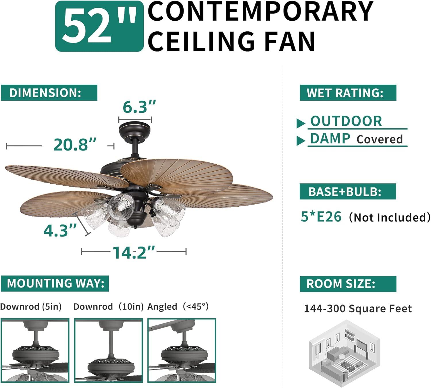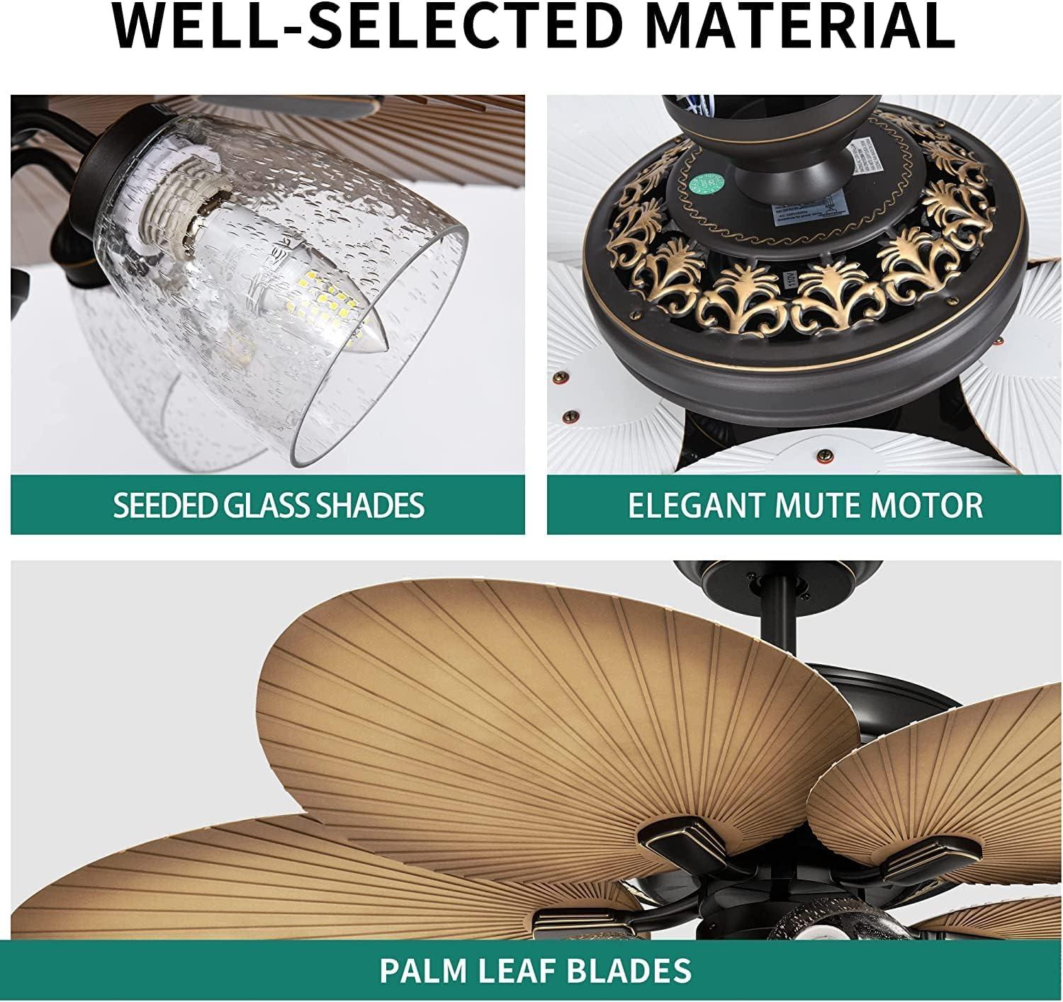 TROPICAL CEILING FAN: The tropical ceiling fan with light and remote has 5 beautiful palm leaf blades and seeded glass light kit, which bringing you a tropical feel whether indoor or outdoor, and ideal for rooms from 144 to 300 square feet, such as living rooms, bedrooms, dining rooms or family rooms