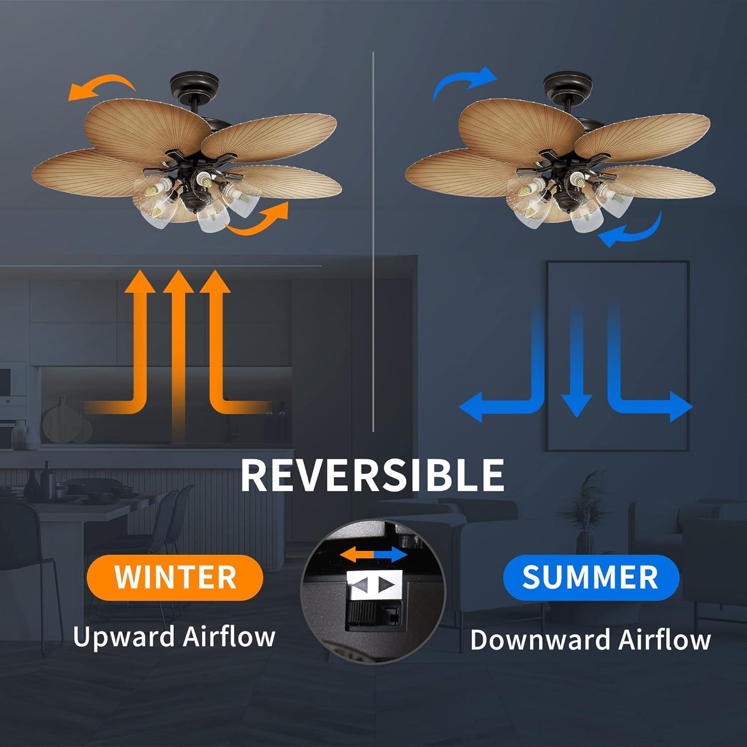 REVERSIBLE AIRFLOW: The leaf ceiling fan for patios allows you to change the direction of rotation so that cool air or warm air is distributed evenly paired year-round help natural air throughout the house, and a timer function for 1/2/4/8 hour timer function to help save energy, which helps you maintain a regular daily routine for reading, working or sleeping