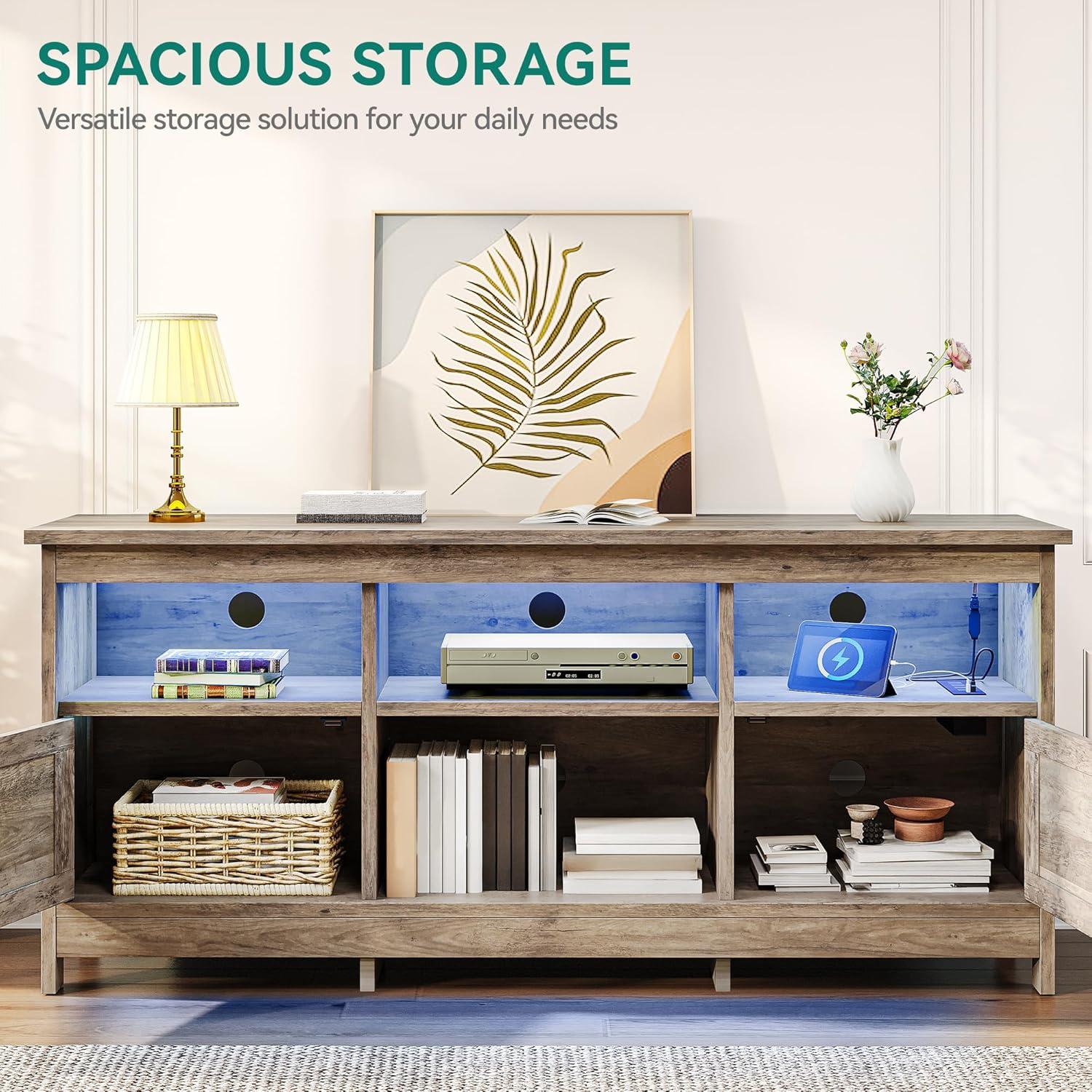 FLEXIBLE STORAGE SOLUTIONS: This TV stand features a customizable storage layout with movable shelves to accommodate items of varying heights; 4 open spaces and 2 storage cabinets provide ample storage space