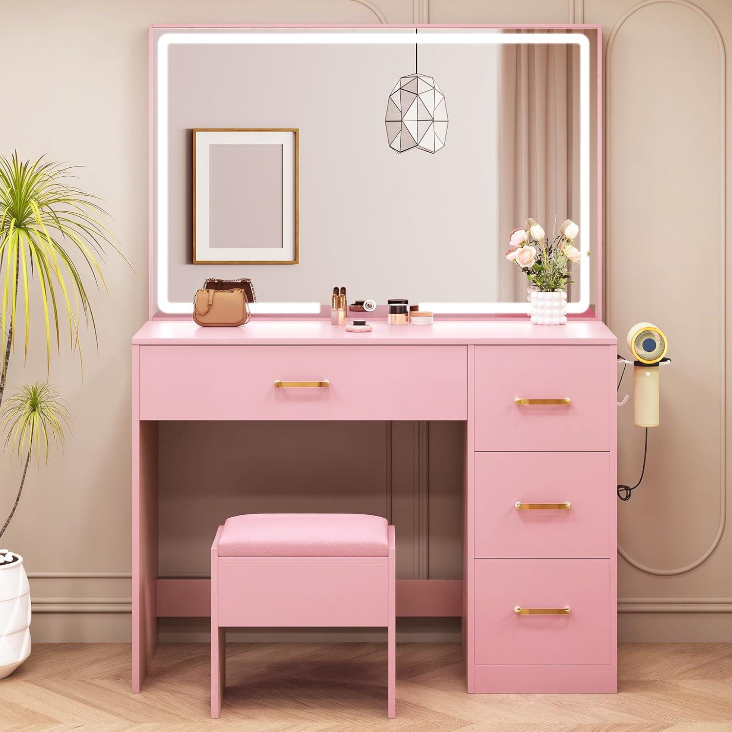 YITAHOME Vanity Desk Set: Makeup Table with Large 35" LED Mirror and Lights, Dressing Table with 4 Drawers & Stool, Adjustable LED Lighting Pink