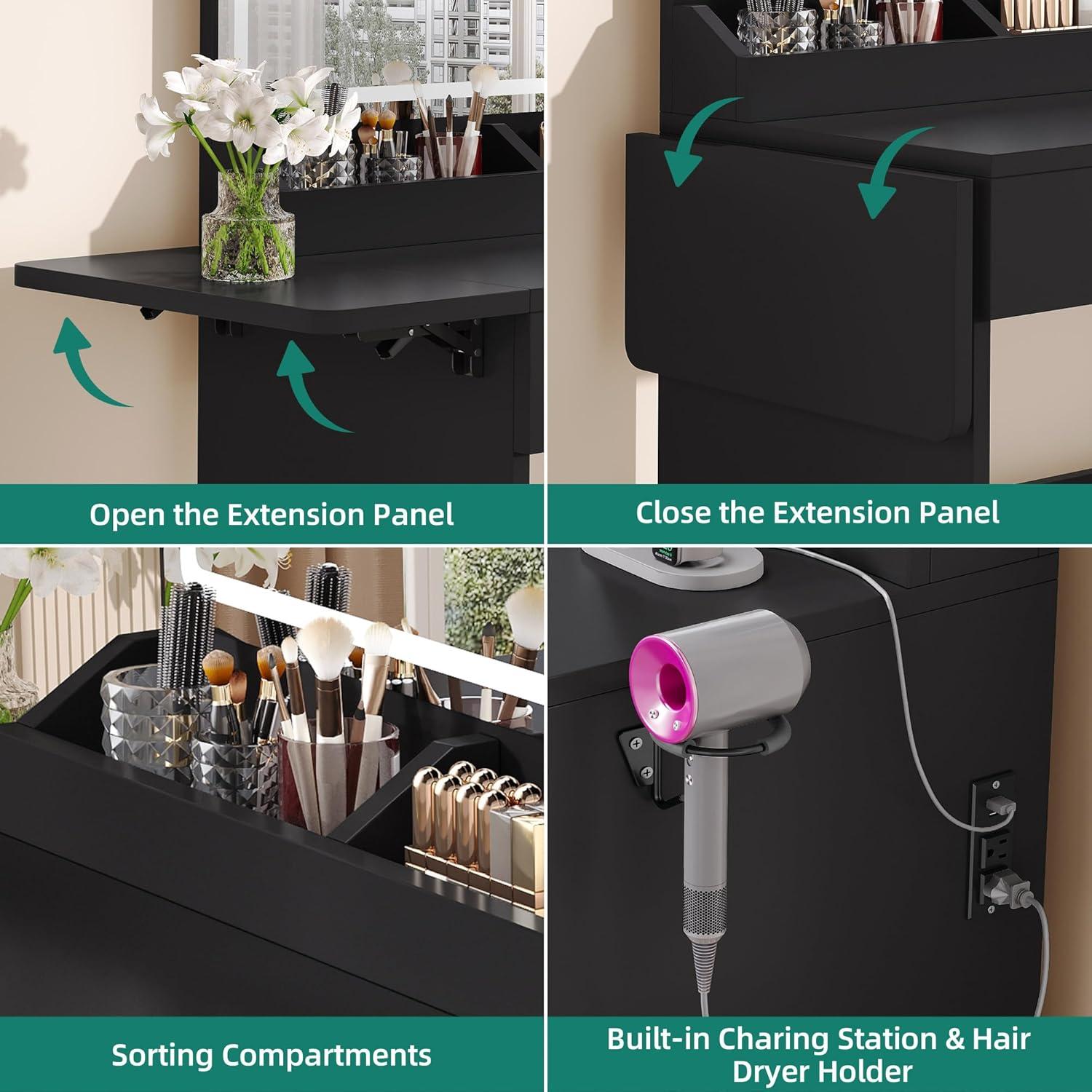 Expandable Top for Flexible Use: Enjoy the space you need when it matters most. The foldable extension provides extra surface for styling and skincare, then tucks away for a clean, compact setup. Ideal for bedrooms or apartments