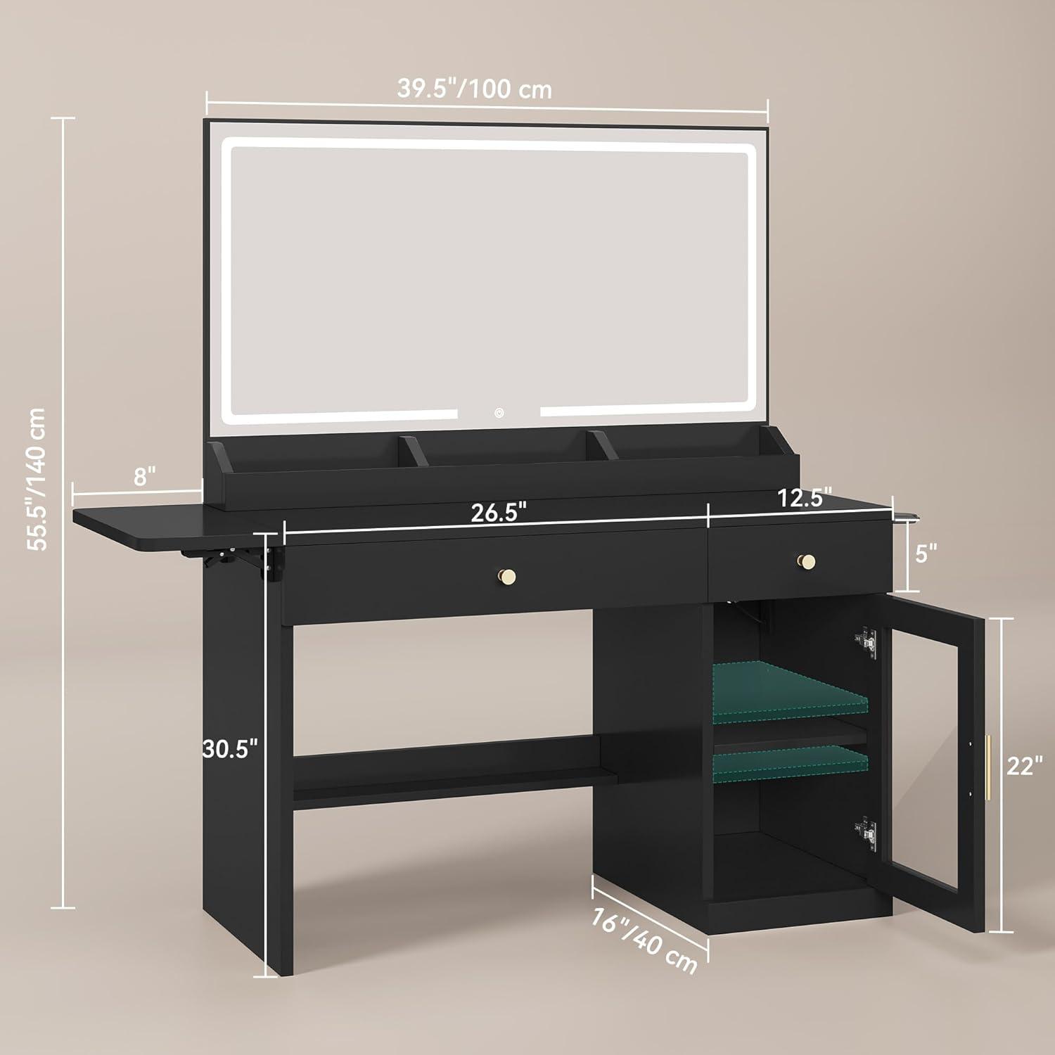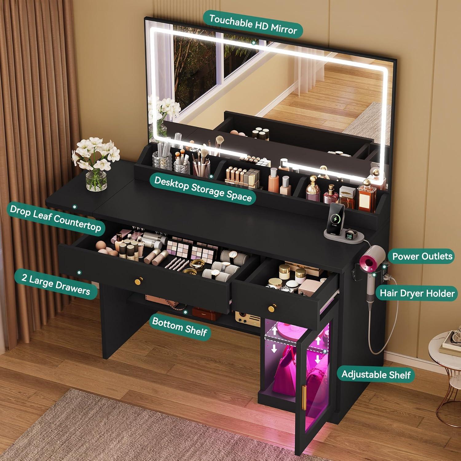 YITAHOME Vanity Desk with Mirror and Lights, RGB Cabinet, Extral Foldable Desk, Makeup Desk with Large Mirror and Power Outlets, Vanity Table Set Bedroom, Dressing Room, Black(Black)