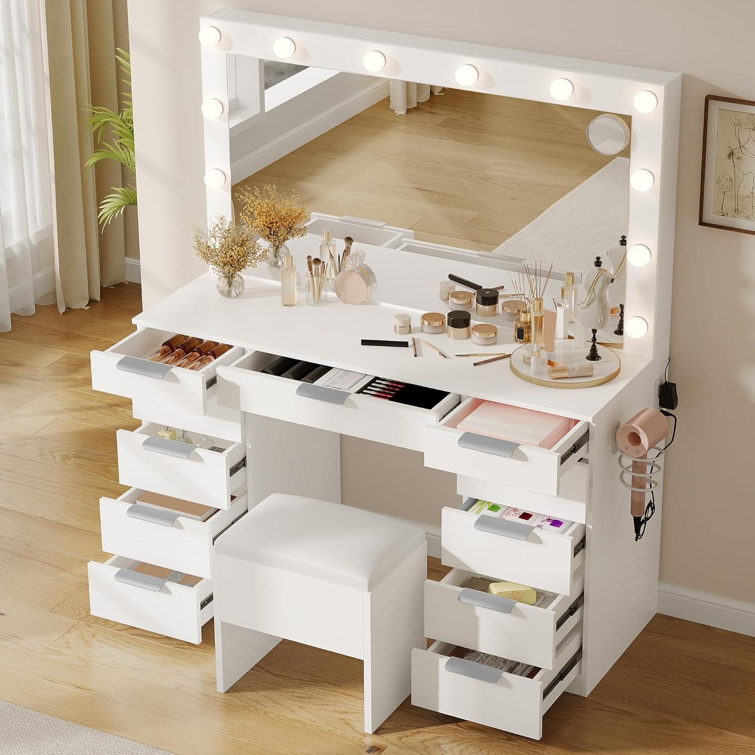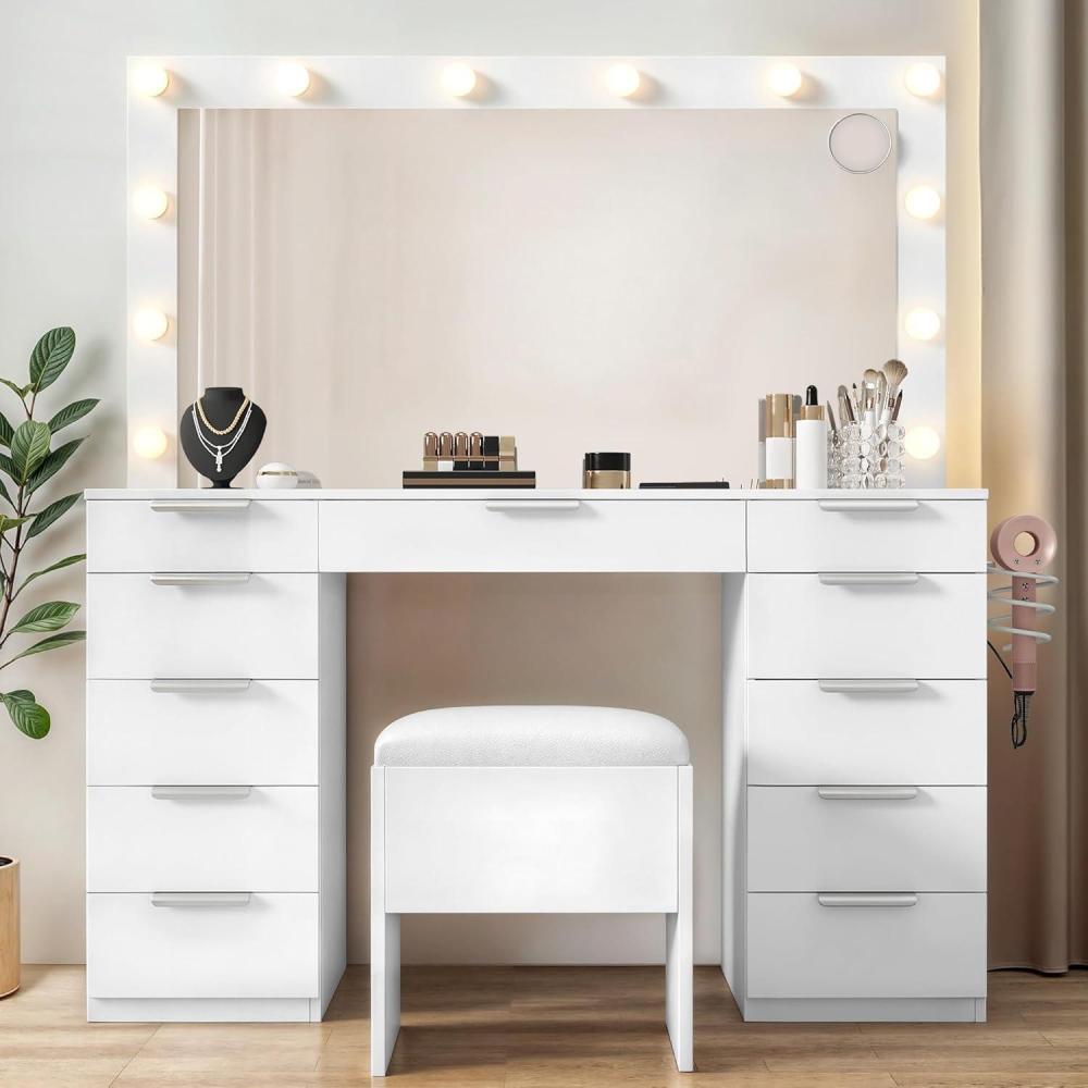 YITAHOME Vanity Table with LED Mirror, 11 Drawer Makeup Desk with Charging Ports, 3 Light Settings & Comfortable Stool(Cream White)