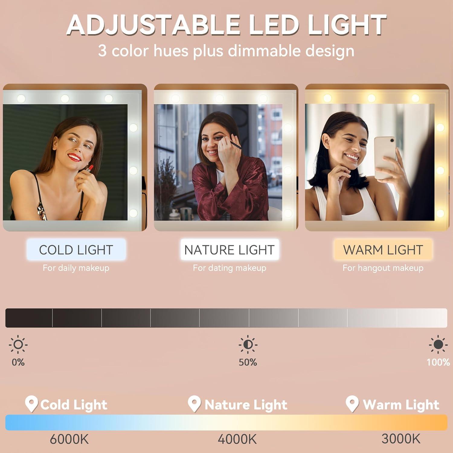 Customizable Mirror Lighting: Elevate your routine with a large mirror surrounded by 12 dimmable LED bulbs; Toggle between three vibrant light modes with a touch to find the ideal glow every time