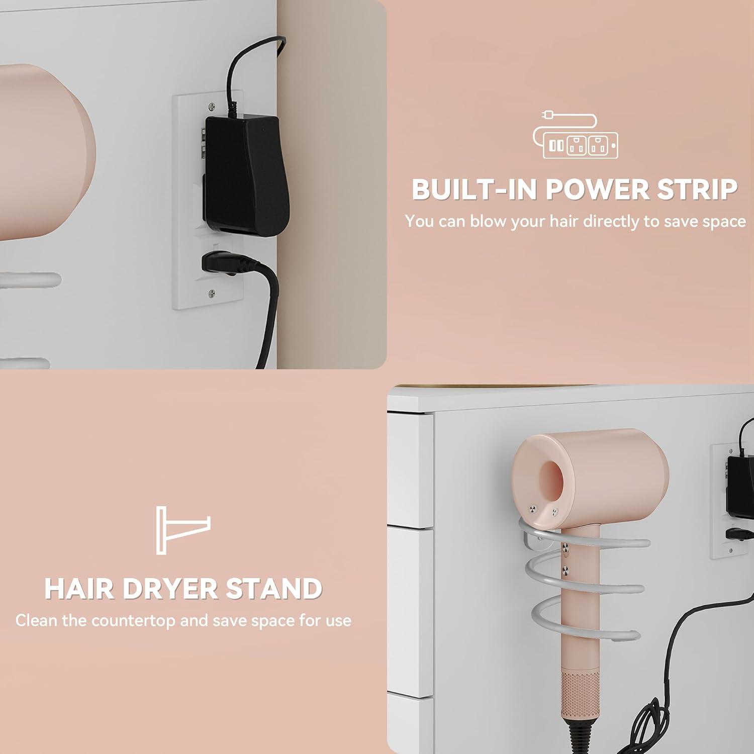 Convenient Power Station: Stay powered up with an integrated hub featuring 2 AC outlets, 1 USB, and 1 Type-C port, plus a built-in hair dryer holder for seamless access to your tools