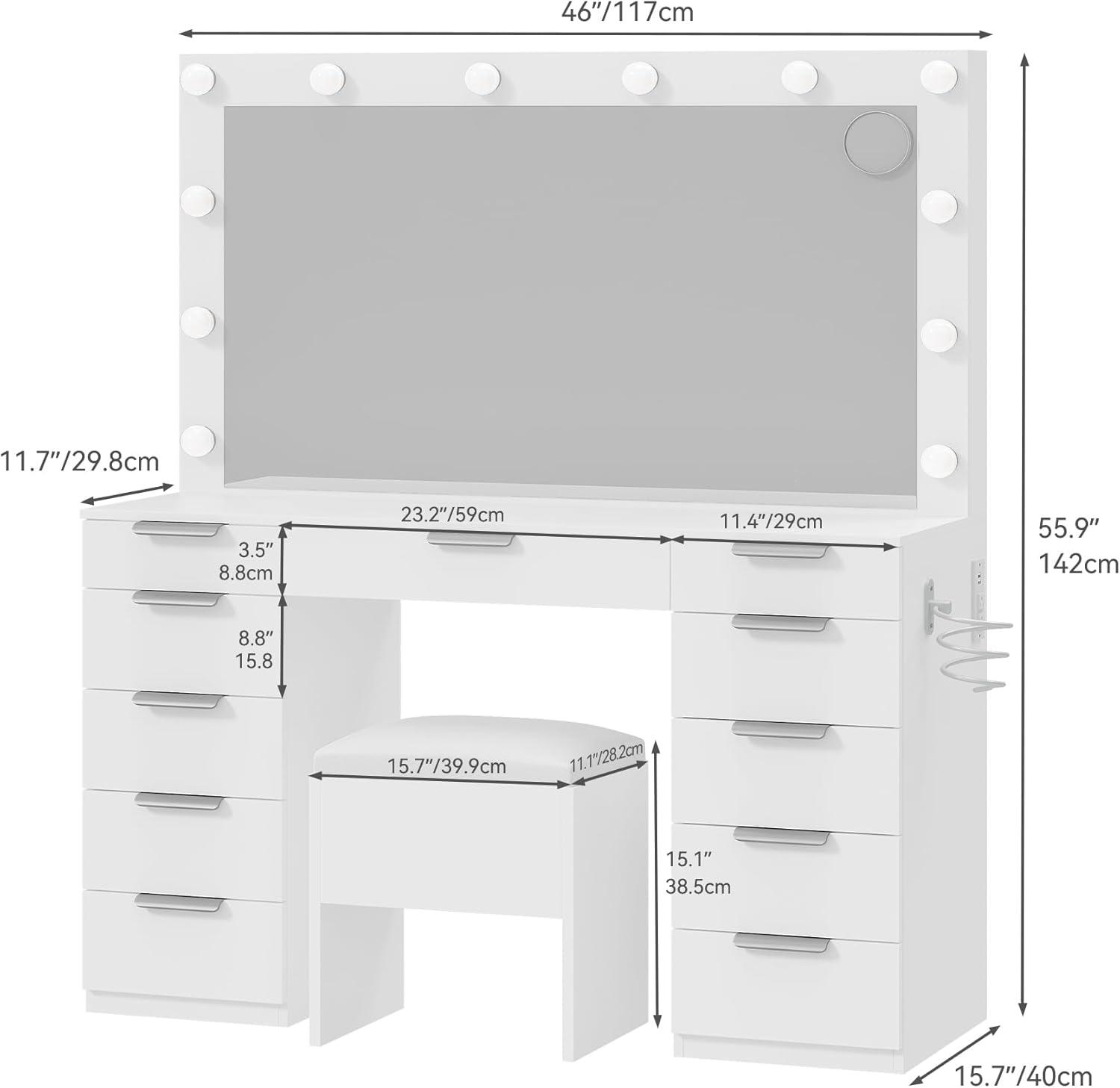 YITAHOME Vanity Table with LED Mirror, 11 Drawer Makeup Desk with Charging Ports, 3 Light Settings & Comfortable Stool(Black)